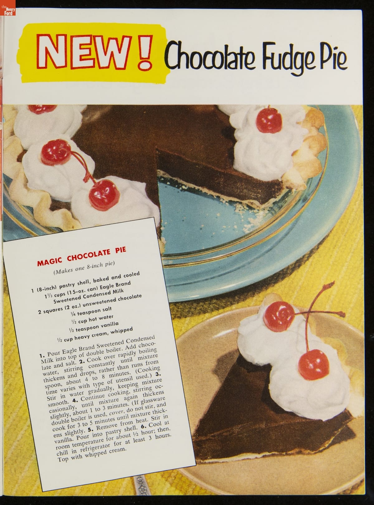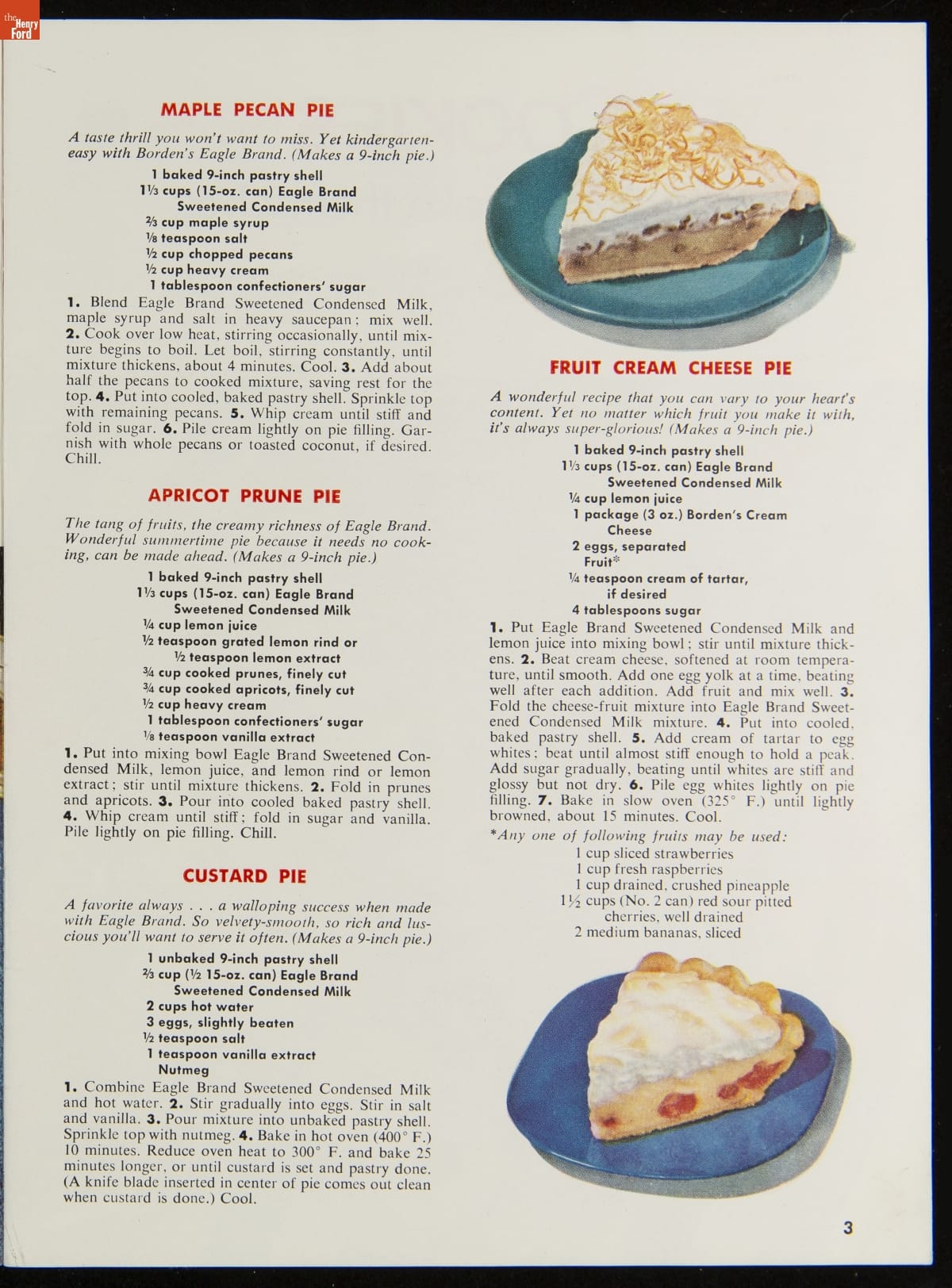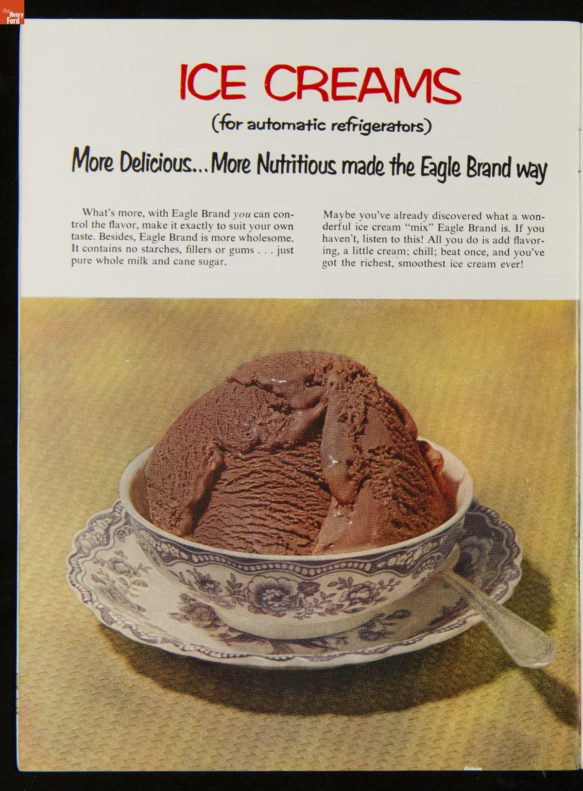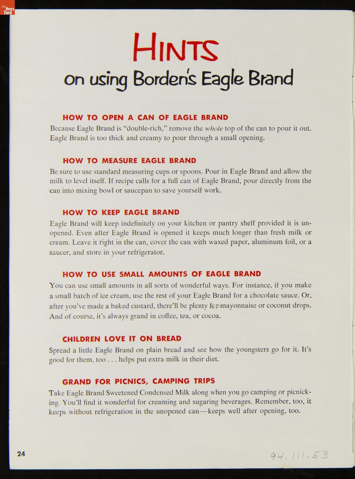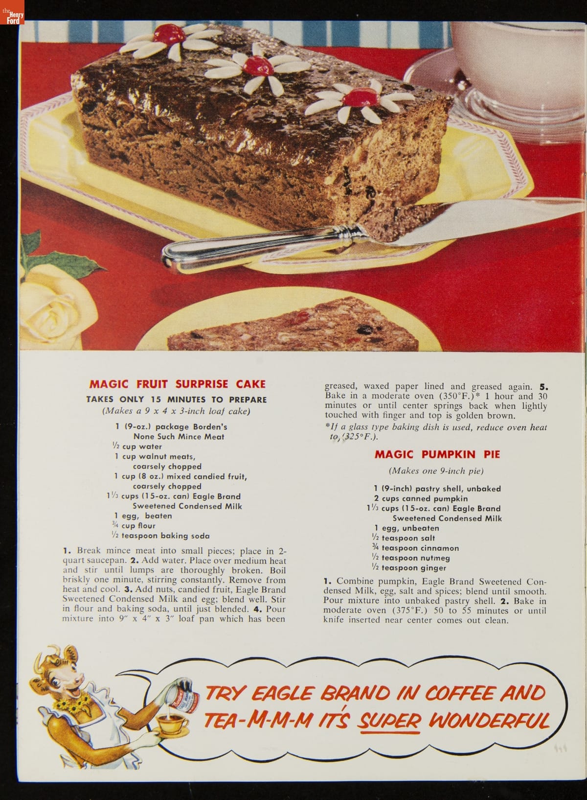 Before the invention of pasteurized milk, fresh milk was often unsafe to drink, as it soured quickly. After experimenting with ways to preserve milk, Gail Borden introduced Eagle Brand Sweetened Condensed Milk in 1856. What was advertised as nourishment for young children soon gained popularity as a baking and cooking ingredient. This booklet from 1961 features recipes for desserts and confections using Eagle Brand Condensed Milk.