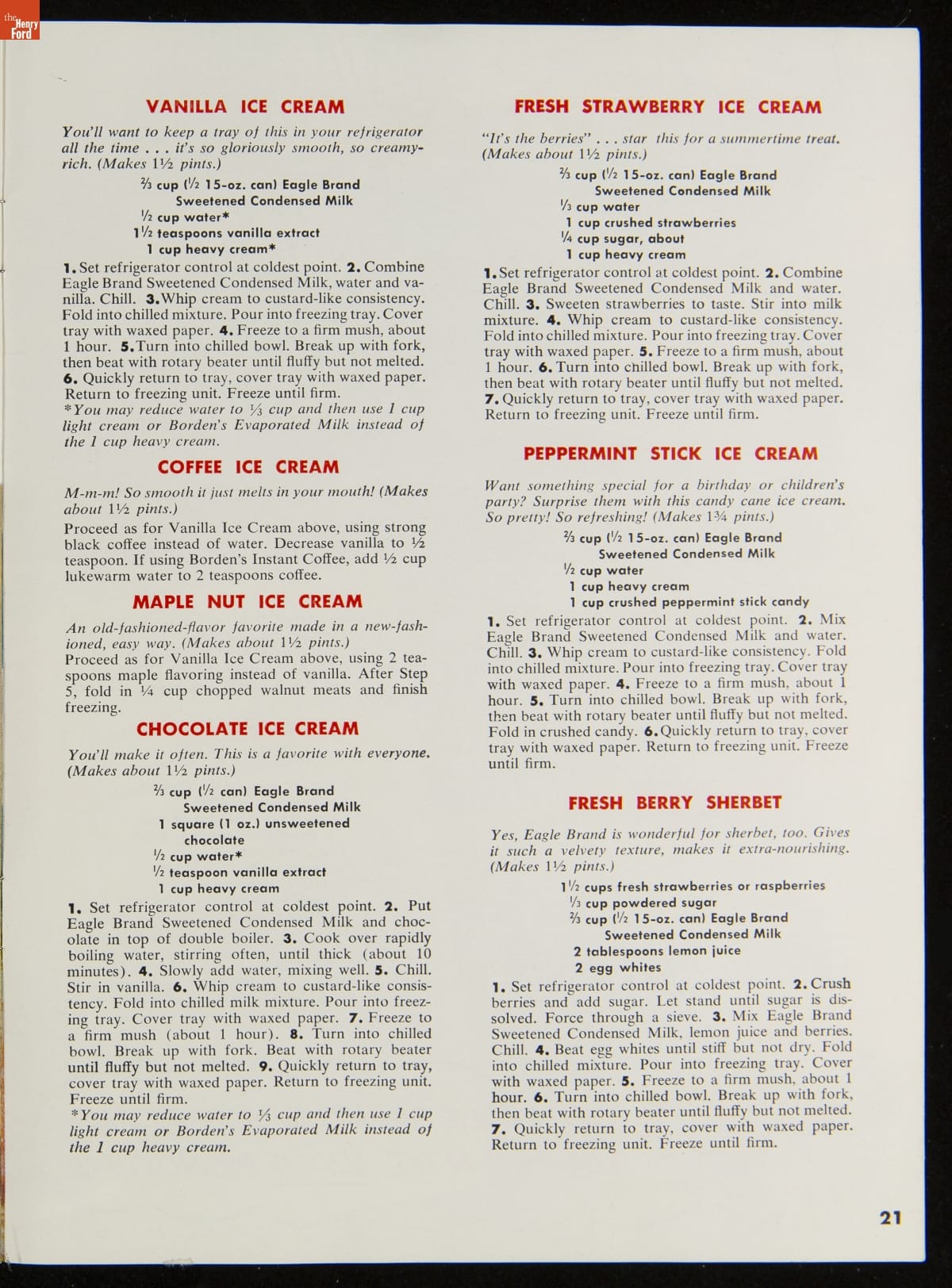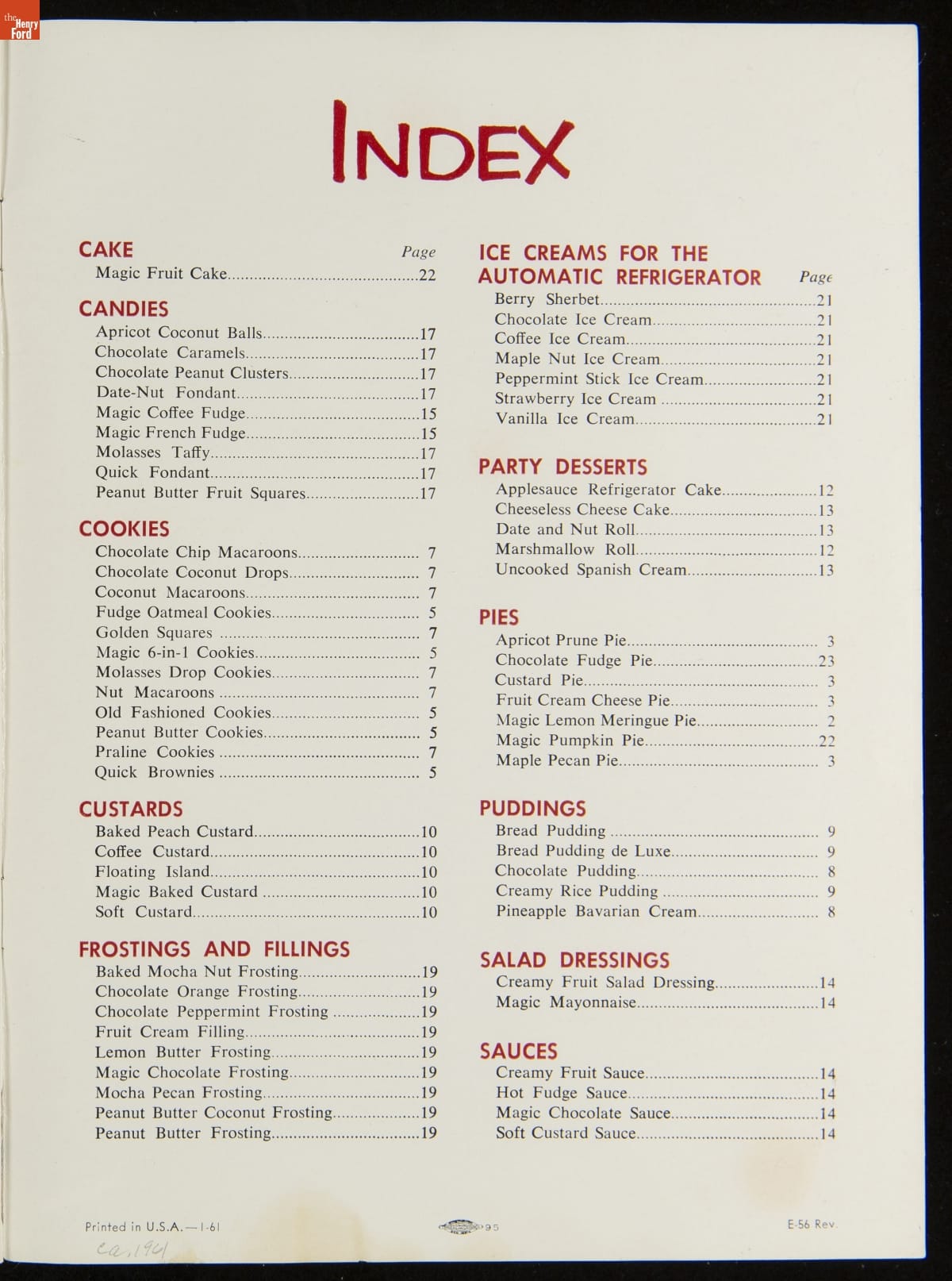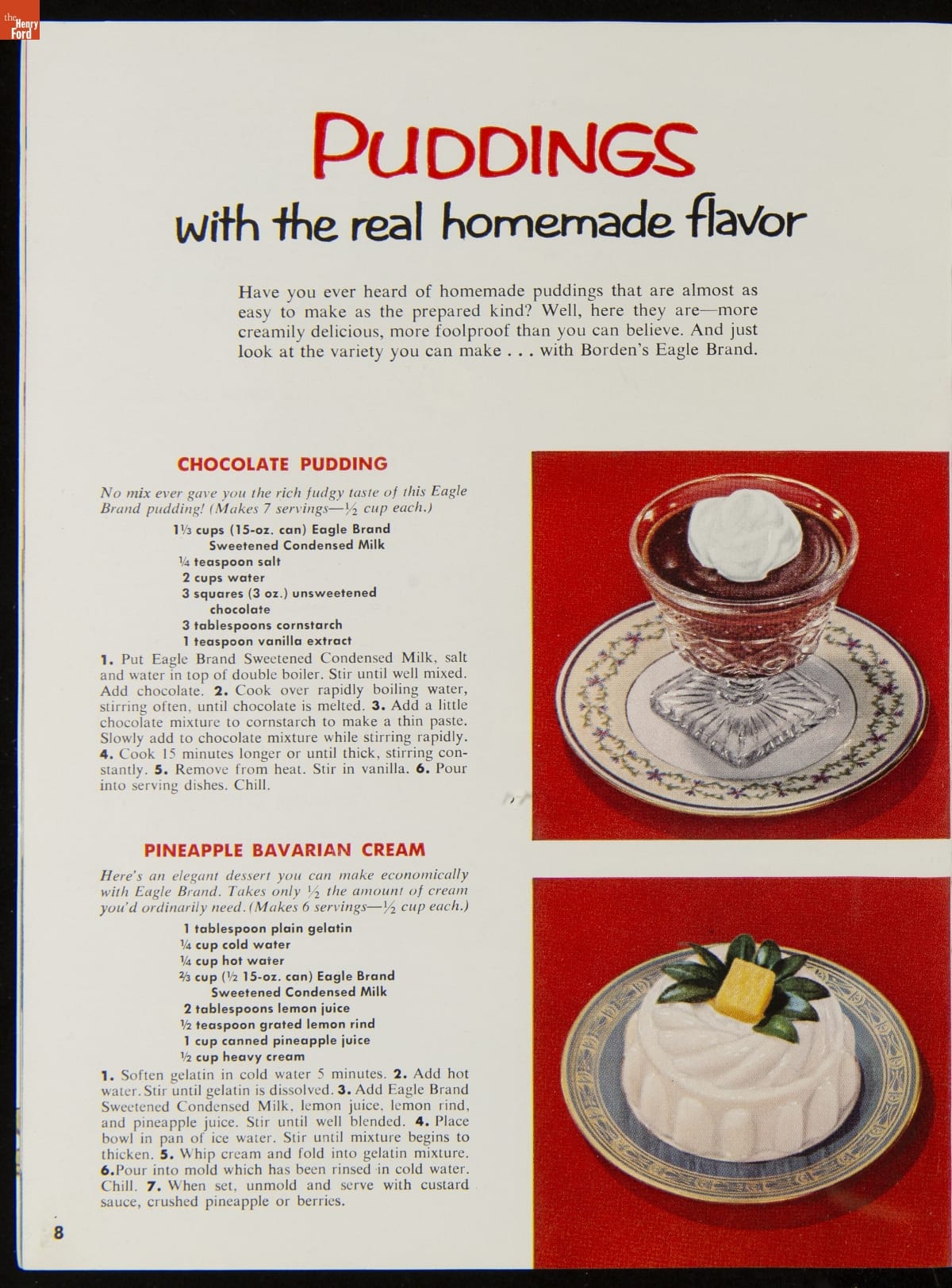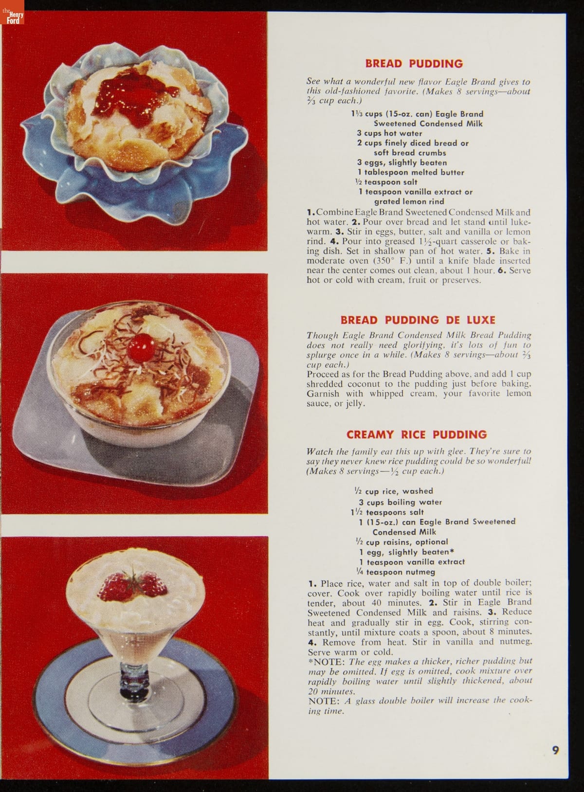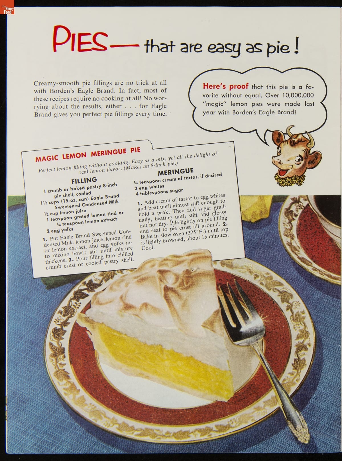 Before the invention of pasteurized milk, fresh milk was often unsafe to drink, as it soured quickly. After experimenting with ways to preserve milk, Gail Borden introduced Eagle Brand Sweetened Condensed Milk in 1856. What was advertised as nourishment for young children soon gained popularity as a baking and cooking ingredient. This booklet from 1961 features recipes for desserts and confections using Eagle Brand Condensed Milk.