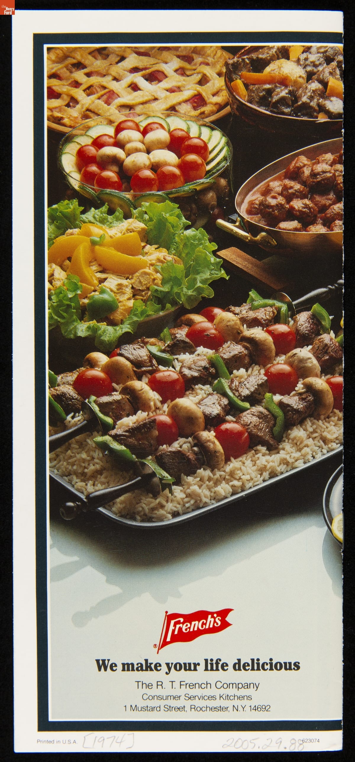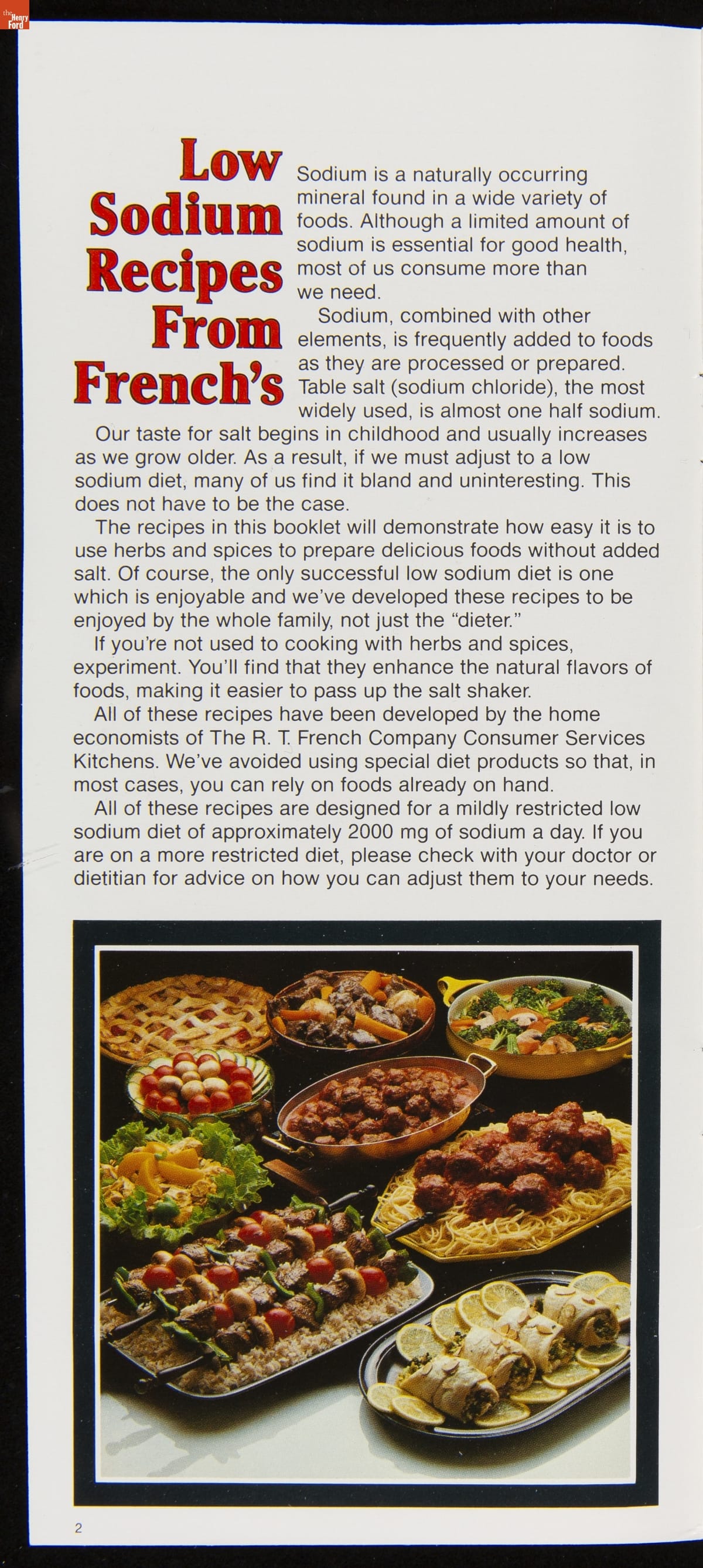 As health concerns regarding sodium intake escalated in the 1970s, many companies sought to calm consumer fears and regain public confidence in their products. One such strategy, as evidenced here by the R.T. French Company, was to provide special recipes to encourage low sodium dining habits. In this booklet, French's offers recipes utilizing a variety of herbs and spices as an alternative to salt.