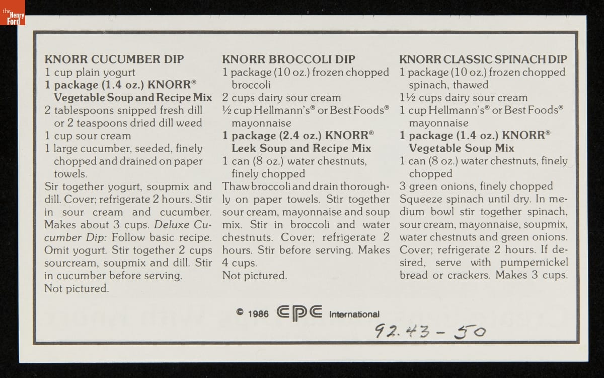 Recipe Card, "Create Sensational Dips with Knorr," 1986