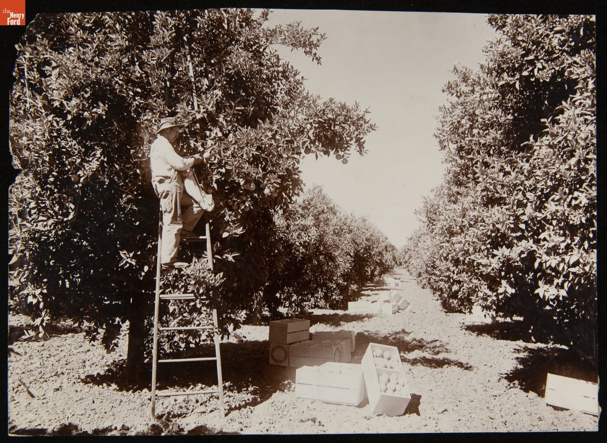 The Riverside Fruit Exchange served California citrus growers and packers starting in 1893. Members of the exchange hand-picked and packed fruit into crates for transportation in refrigerated railcars to eastern markets. Commons crops included navel oranges and lemons. This worker harvested grapefruit, a crop promoted by the exchange in response to competition from grapefruit growers in Florida and Texas.