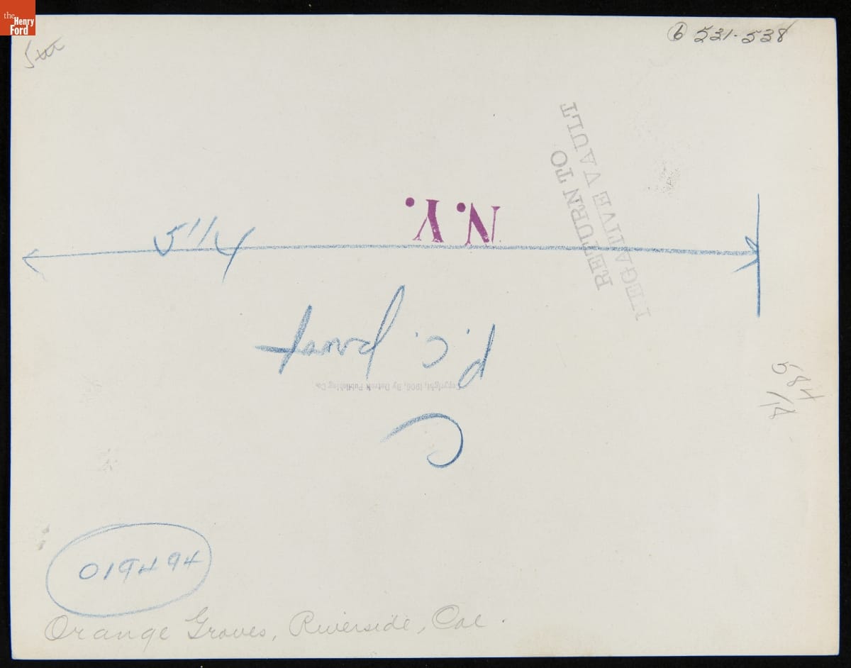 Orange growers and packers in Riverside, California, joined forces to launch the Riverside Fruit Exchange in 1893. The exchange marketed navel oranges, grown in expansive groves like this one. To increase production of the sweet, seedless crop consumers craved, growers propagated new trees by grafting buds onto rootstock. At harvest time, workers hand-picked and packed the oranges for sale.