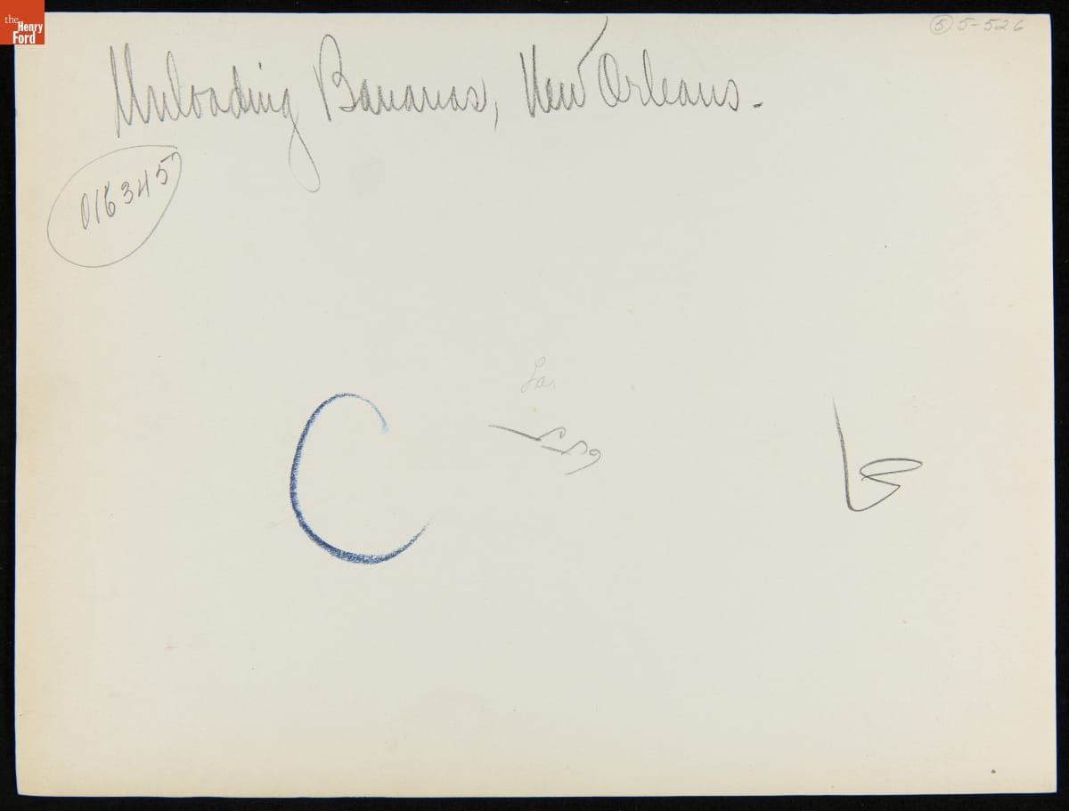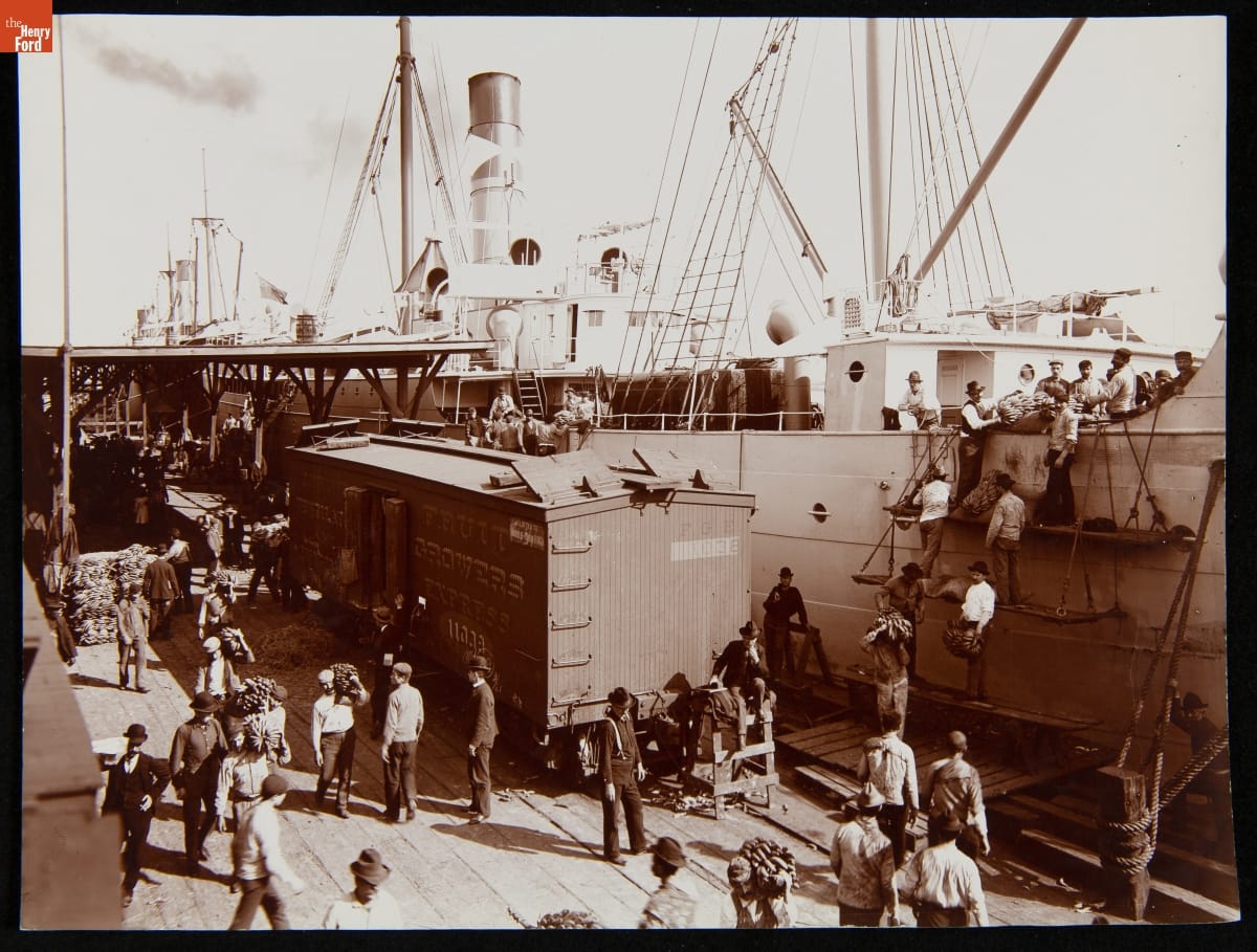 Bananas arrived on grocery store shelves via a transportation system controlled by competing fruit companies and their government allies. Refrigerated railcars moved the crop from Central American plantations to ships bound for U.S. ports in the Gulf of Mexico. This photograph shows dockworkers in New Orleans, Louisiana, transferring bunches of bananas -- each weighing around 86 pounds -- to a refrigerated railcar for transport to market.