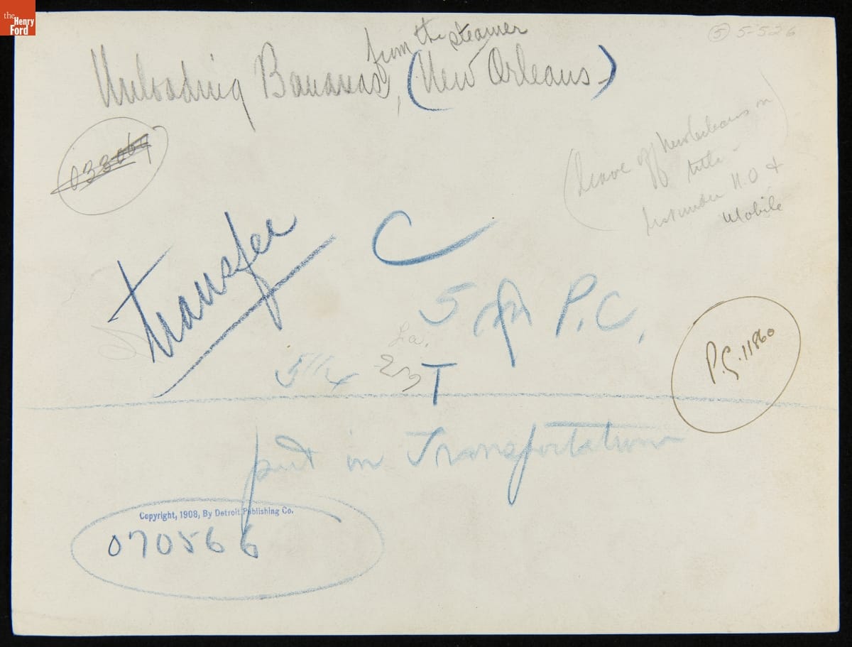 Bananas arrived on grocery store shelves via a transportation system controlled by competing fruit companies and their government allies. Refrigerated railcars moved the crop from Central American plantations to ships bound for U.S. ports in the Gulf of Mexico. This photograph shows dockworkers in New Orleans, Louisiana, transferring bunches of bananas -- each weighing around 86 pounds -- to a refrigerated railcar for transport to market.