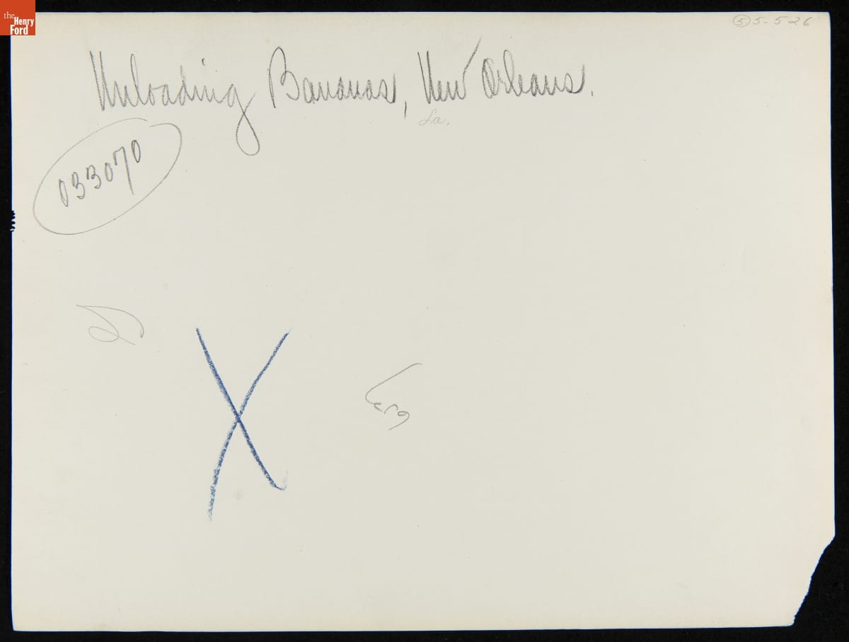 Bananas arrived on grocery store shelves via a transportation system controlled by competing fruit companies and their government allies. Refrigerated railcars moved the crop from Central American plantations to ships bound for U.S. ports in the Gulf of Mexico. This photograph shows dockworkers in New Orleans, Louisiana, transferring bunches of bananas -- each weighing around 86 pounds -- to a refrigerated railcar for transport to market.