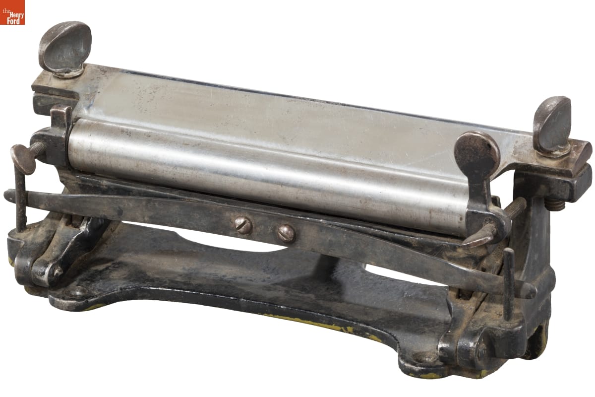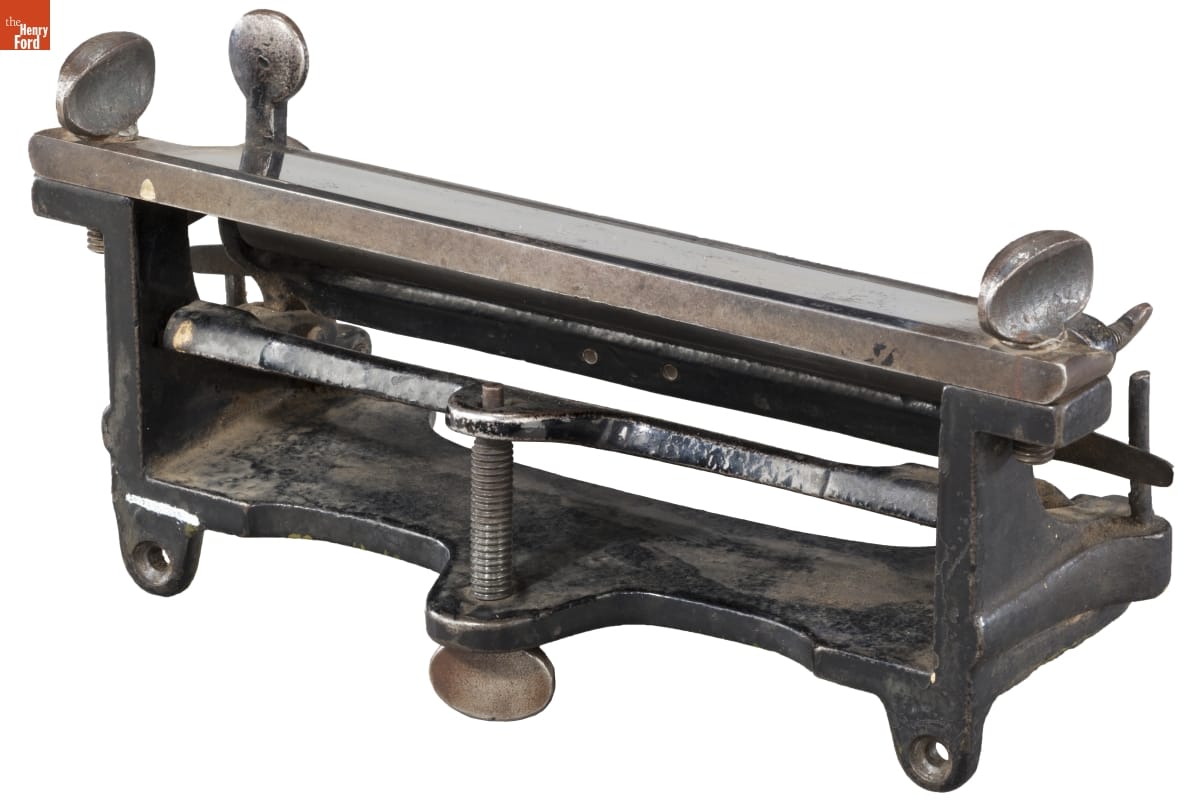 Leather splitters were designed primarily for use in the harness and saddle industry. A leatherworker fed a thick leather strap into the splitter then pulled it through the roller and blade mechanism. This reduced or "split" the piece of leather into a layer of uniform, workable thickness. This machine was produced by C. S. Osborne and Company, one of the oldest manufacturers of leatherworking tools.