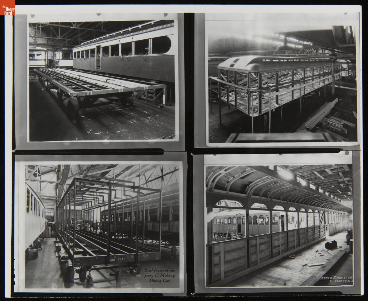 The New Jersey-based Jerry O'Mahony Dining Cars was one of the leading diner manufacturers for decades, building hundreds of diners in numerous styles and giving many diner builders their start as they spun off to start their own businesses. This contact sheet of 4"x5" negatives, created 1975 for Richard J. S. Gutman's book, American Diner, shows dining cars being constructed.