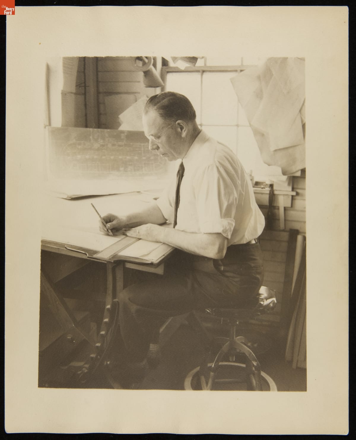 Merritt McConnell, Senior Draftsman for the J.B. Judkins Company, Seated at Desk, circa 1940