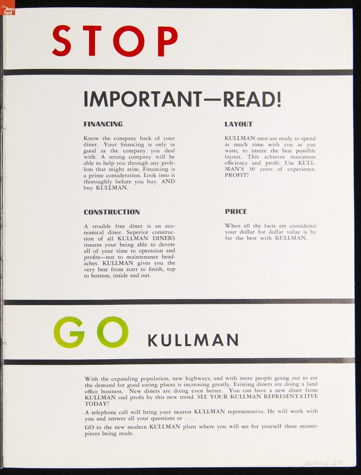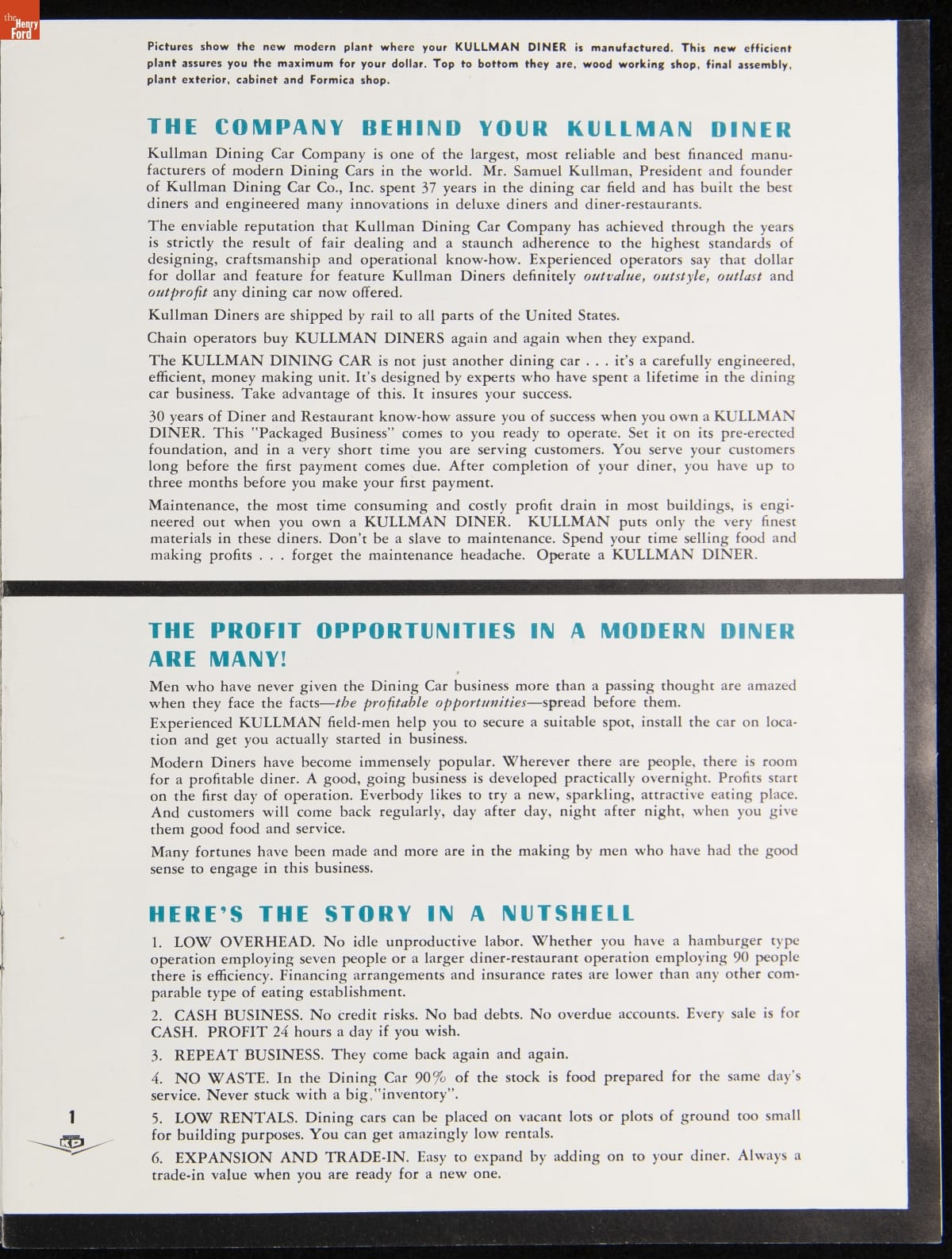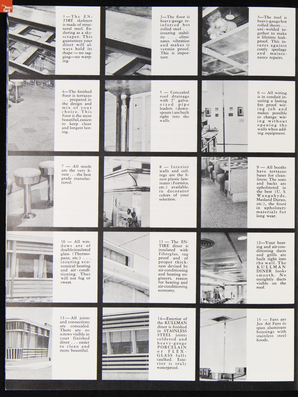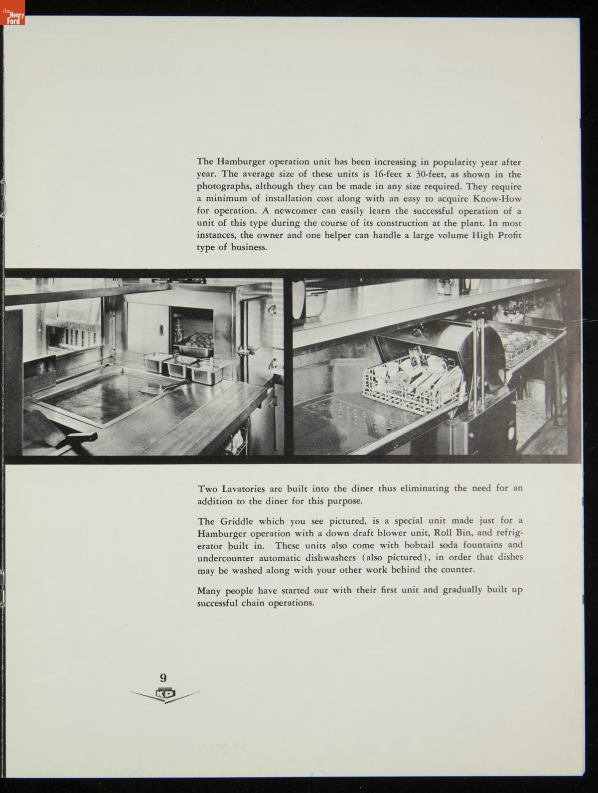 The New Jersey-based Kullman Dining Car Company, founded in 1927, was one of the longest-lived companies in the diner business. Continually responding to changing market needs, Kullman produced some of the largest, best designed restaurant-type models in the industry during the 1950s. The newest models of diner-restaurants are featured in this ca. 1957 catalog.