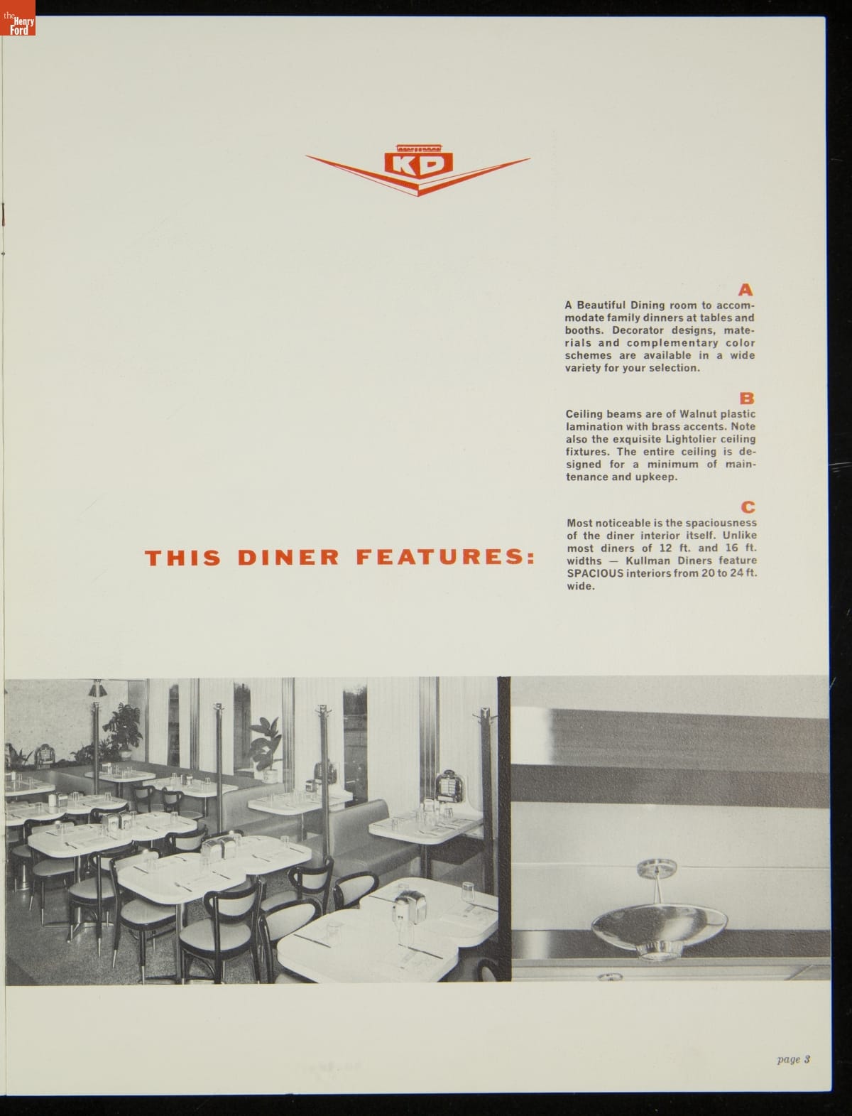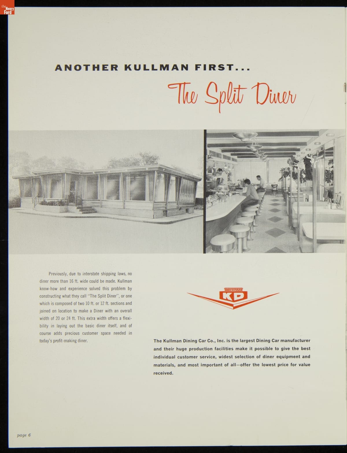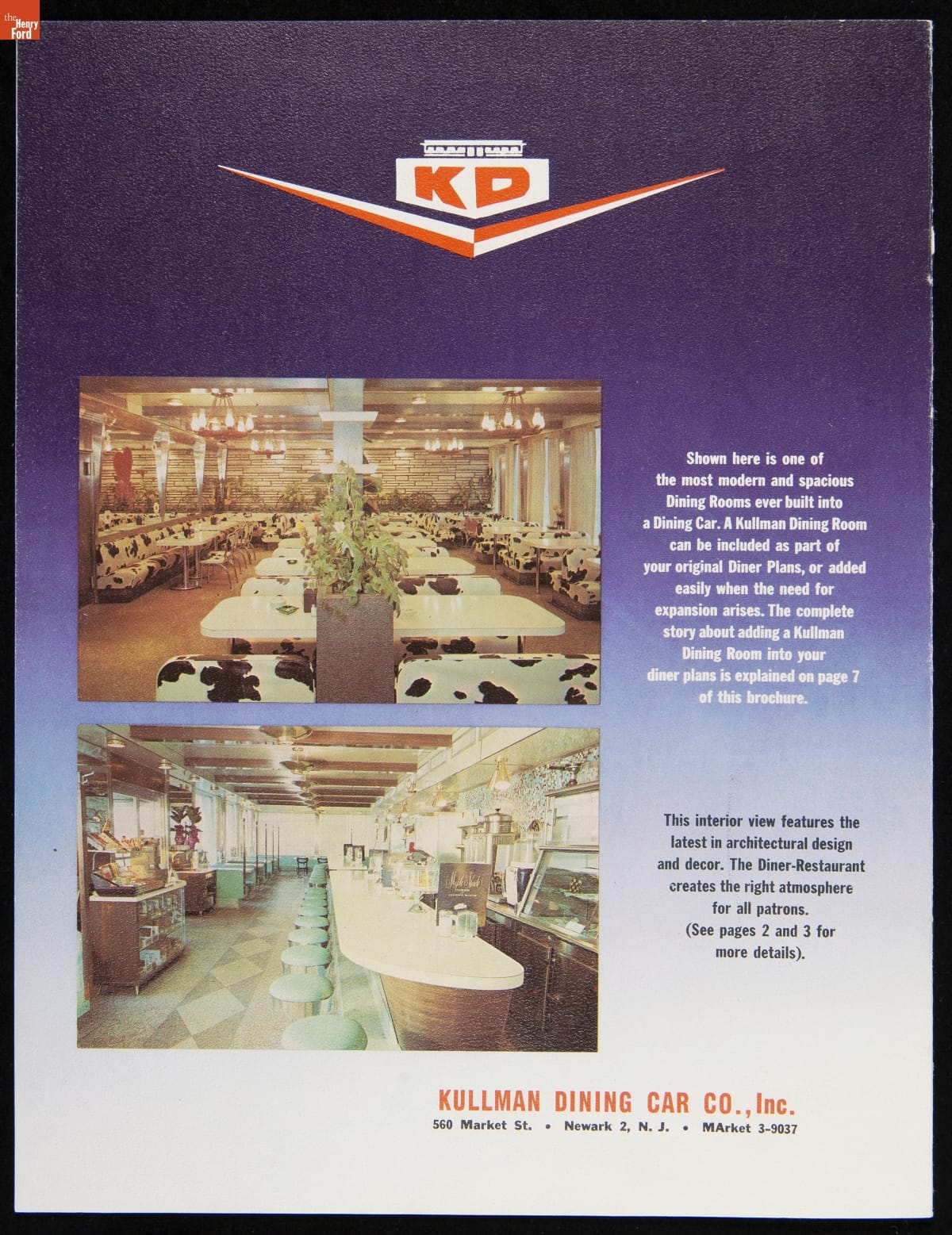 The New Jersey-based Kullman Dining Car Company, founded in 1927, was one of the longest-lived companies in the diner business. Continually responding to changing market needs, Kullman produced some of the largest, best designed restaurant-type models in the industry during the 1950s. The newest models of diner-restaurants are featured in this ca. 1958 catalog.