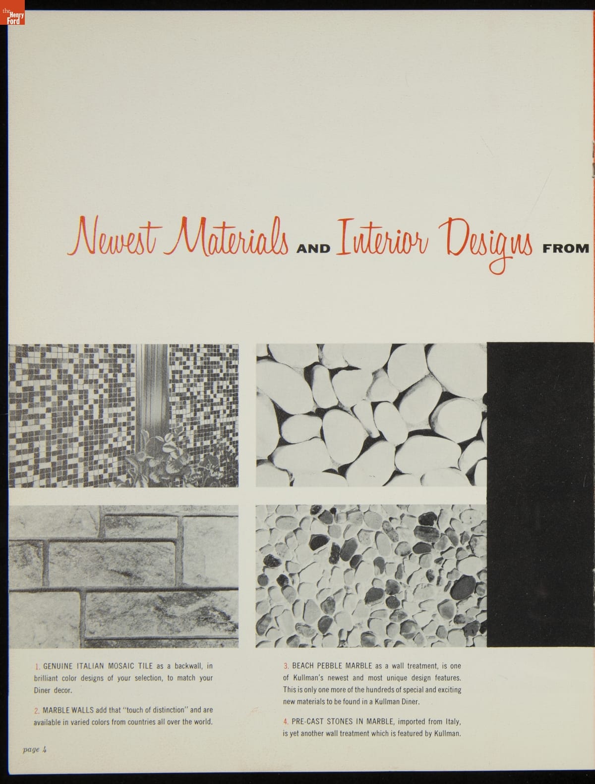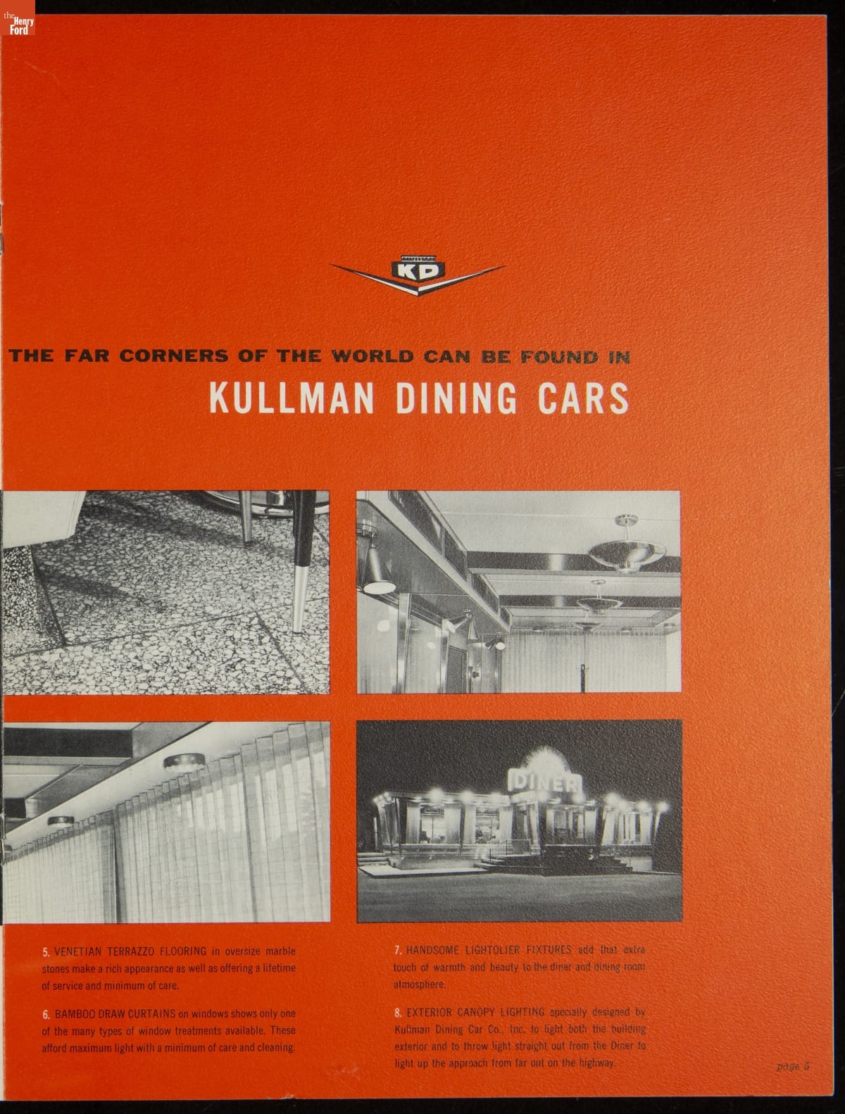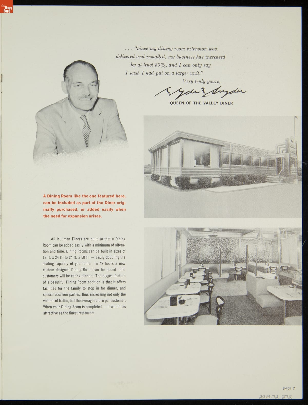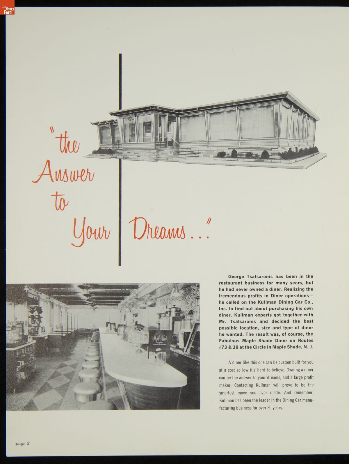 The New Jersey-based Kullman Dining Car Company, founded in 1927, was one of the longest-lived companies in the diner business. Continually responding to changing market needs, Kullman produced some of the largest, best designed restaurant-type models in the industry during the 1950s. The newest models of diner-restaurants are featured in this ca. 1958 catalog.