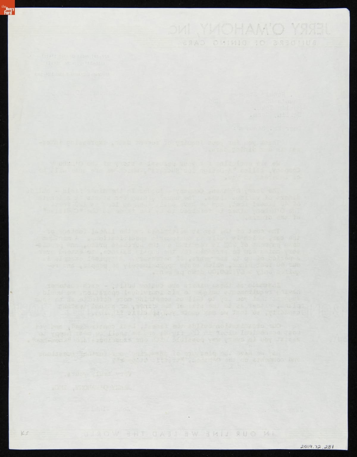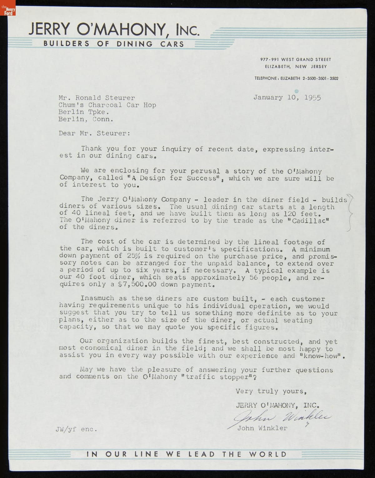 Letter from Jerry O'Mahony Diner Company to Ronald Steurer, January 10, 1955