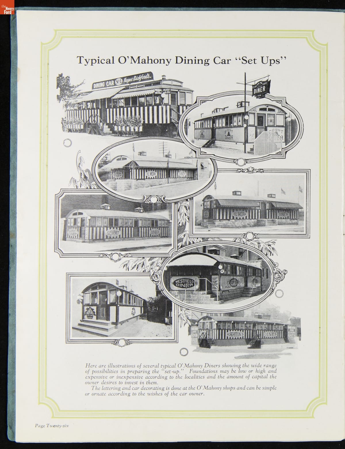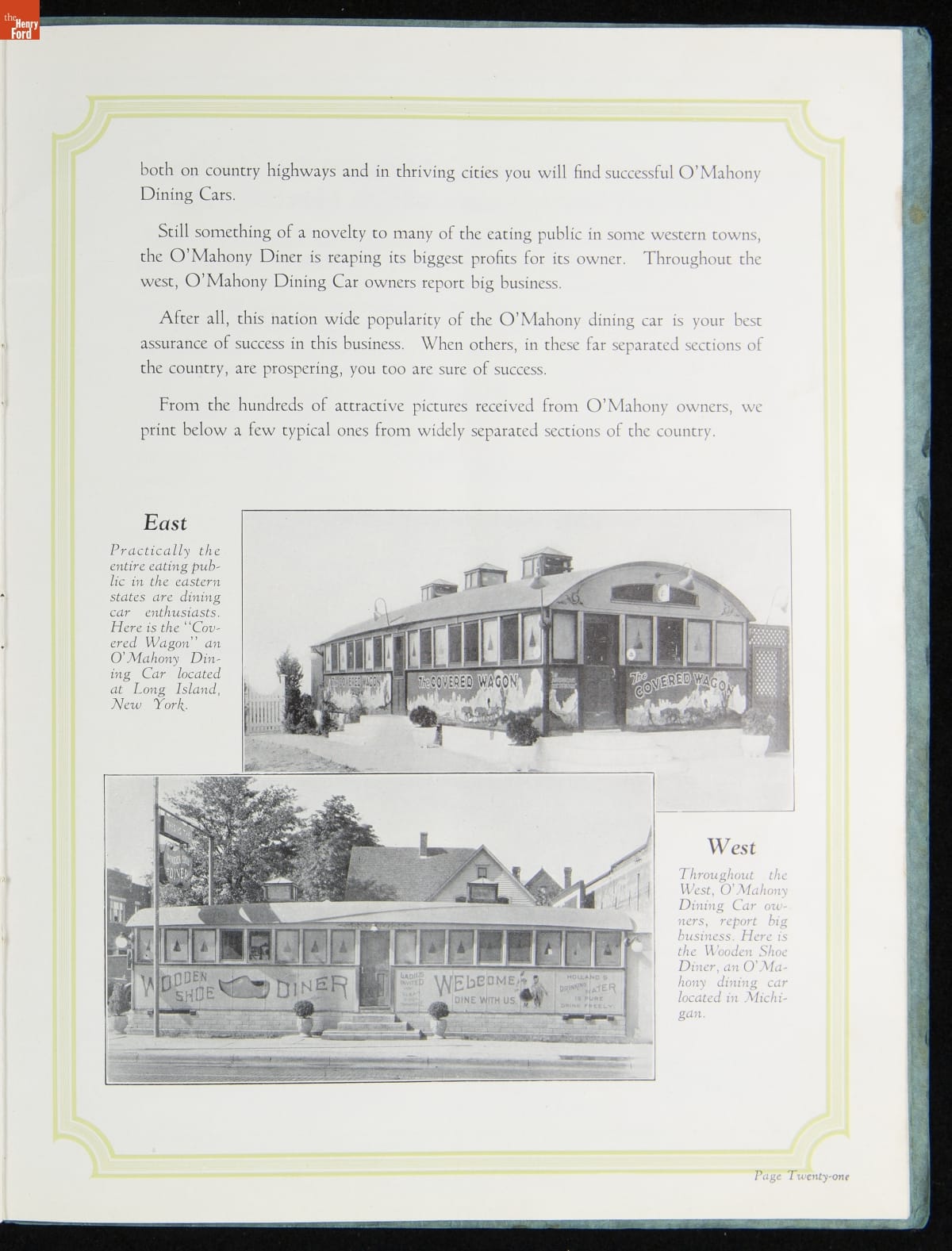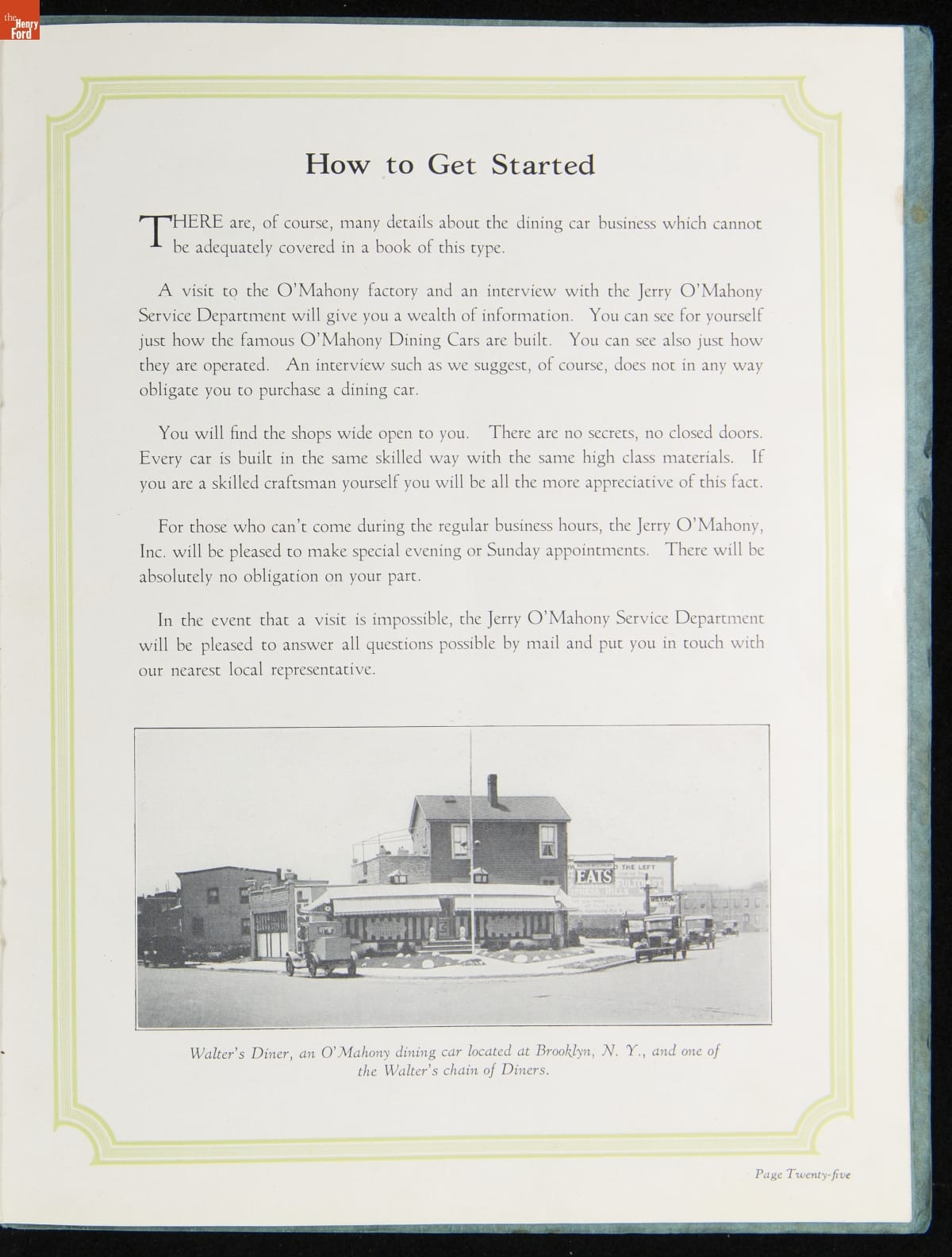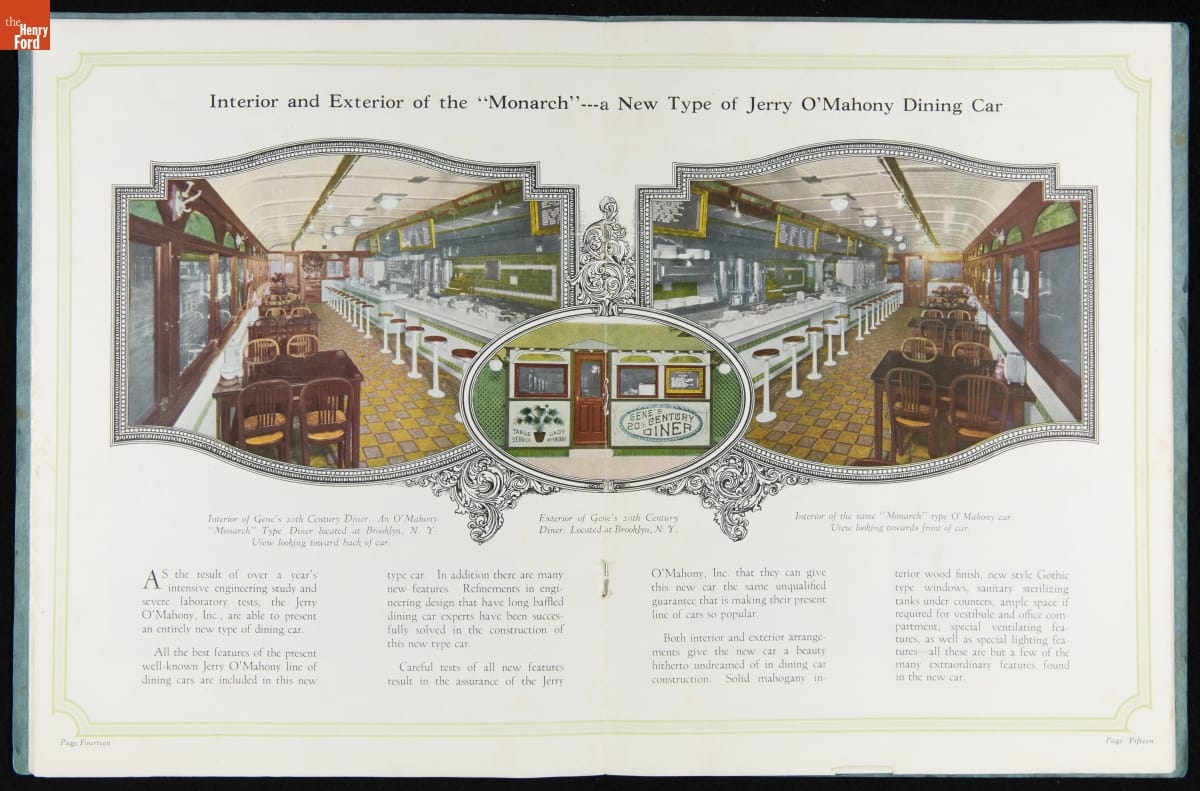The New Jersey-based Jerry O'Mahony Dining Cars was one of the leading diner manufacturers for decades, building hundreds of diners in numerous styles and giving many diner builders their start. This 1928 catalog features its new steel dining car, the "Monarch," along with its other models and advice to would-be operators.