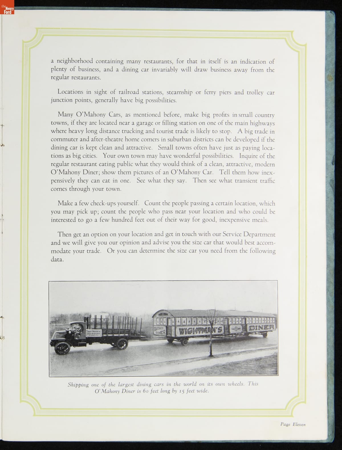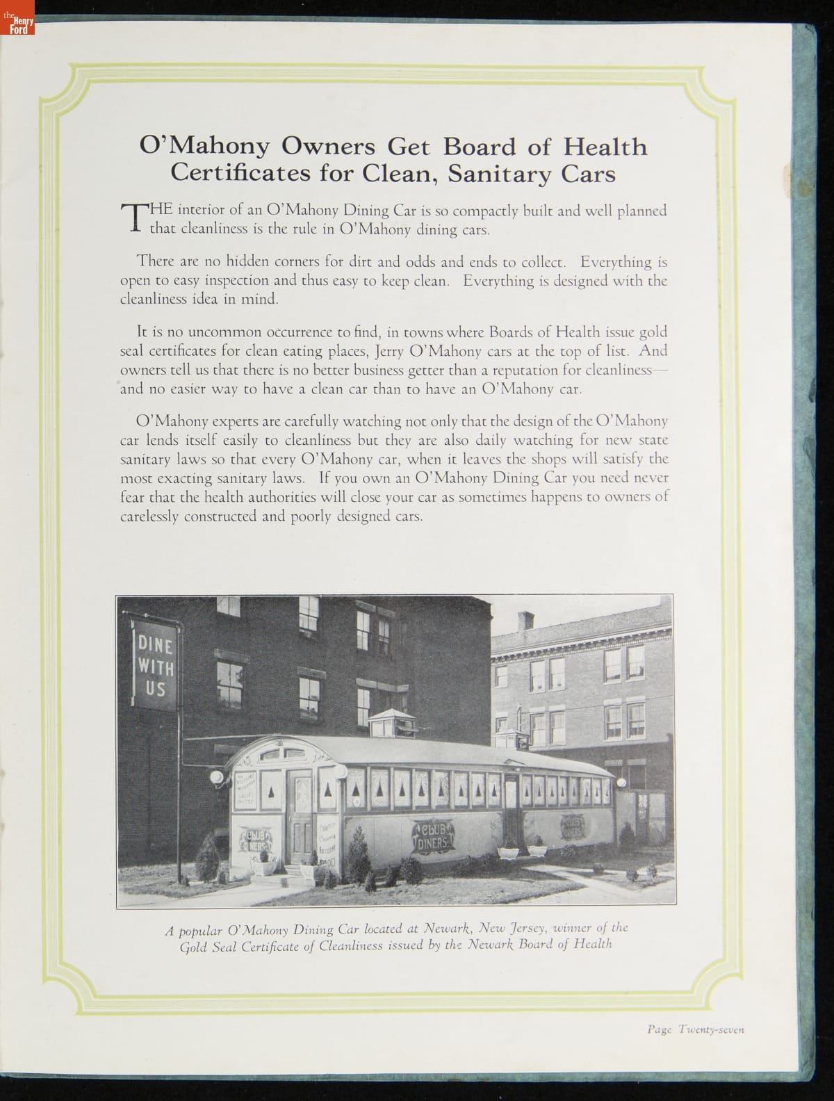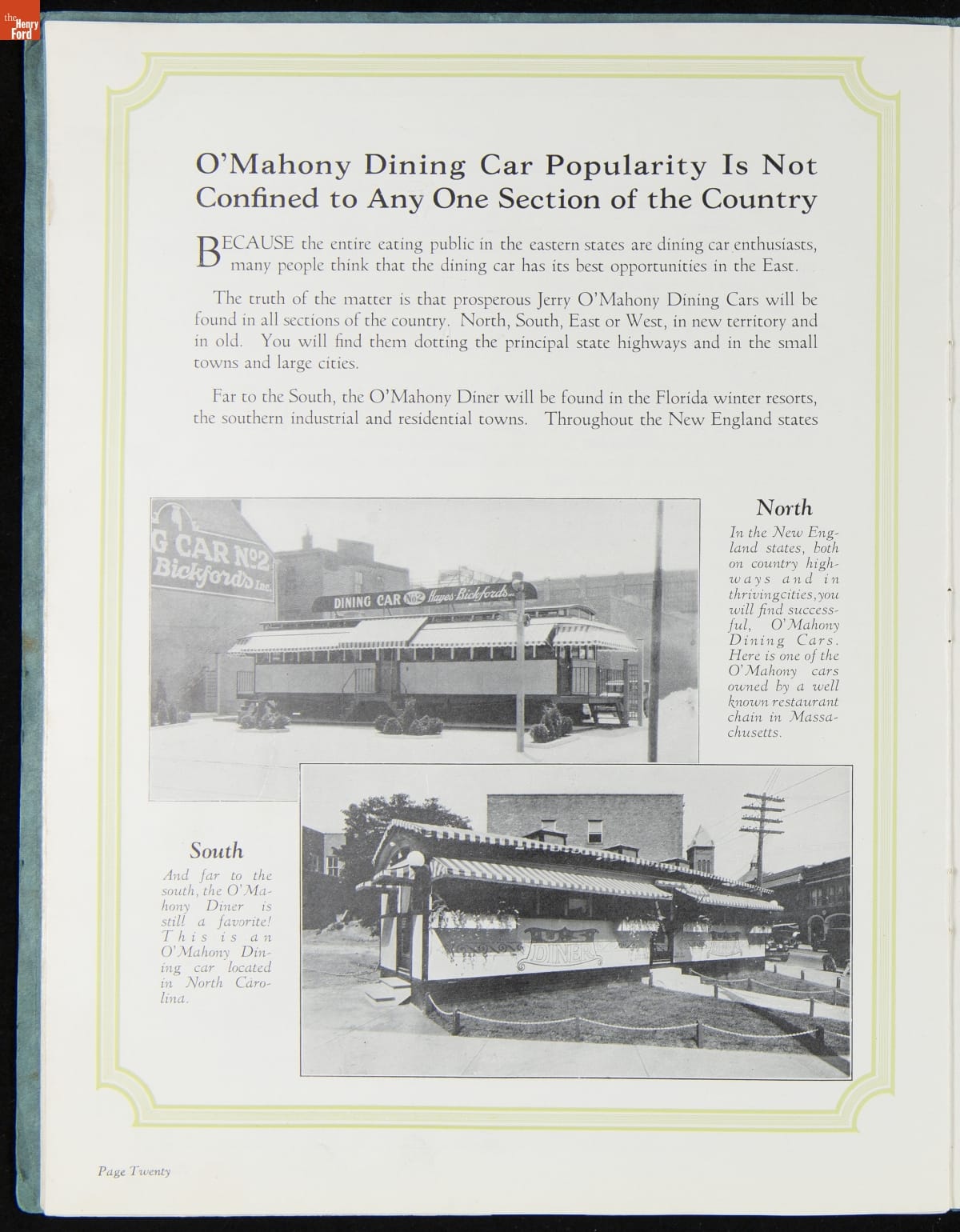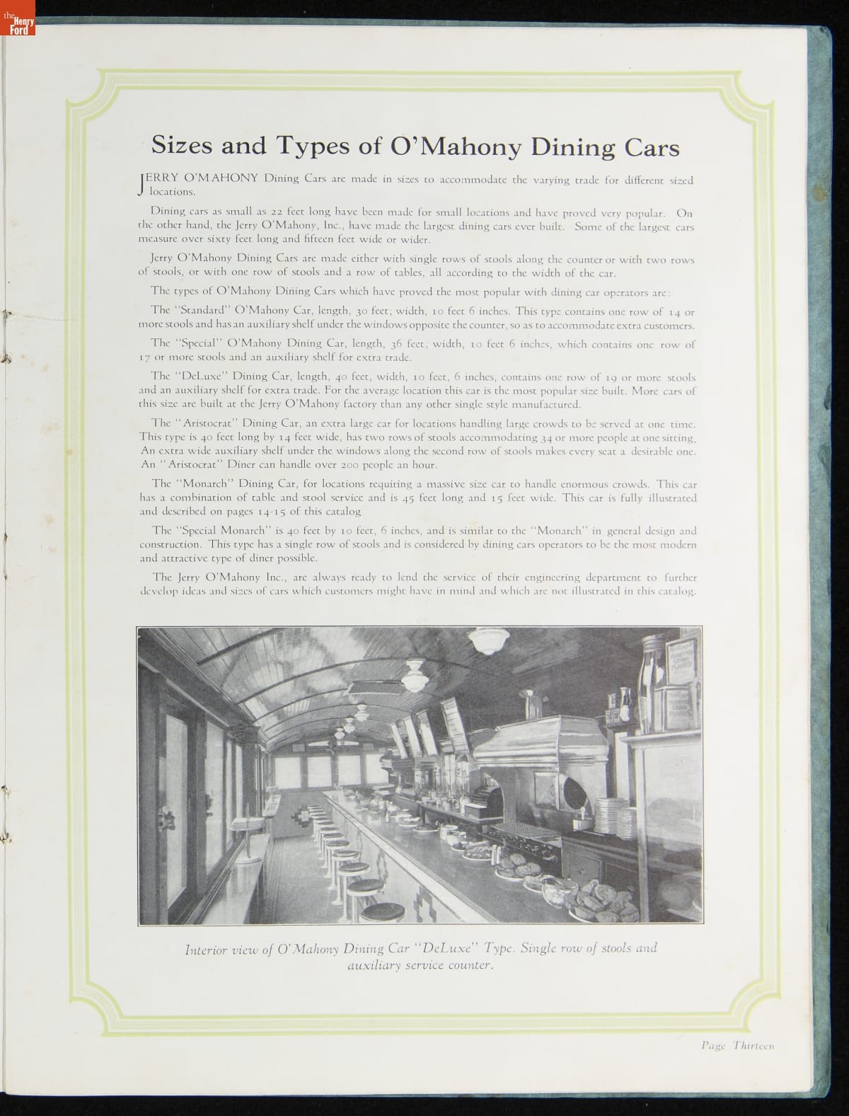 The New Jersey-based Jerry O'Mahony Dining Cars was one of the leading diner manufacturers for decades, building hundreds of diners in numerous styles and giving many diner builders their start. This 1928 catalog features its new steel dining car, the "Monarch," along with its other models and advice to would-be operators.