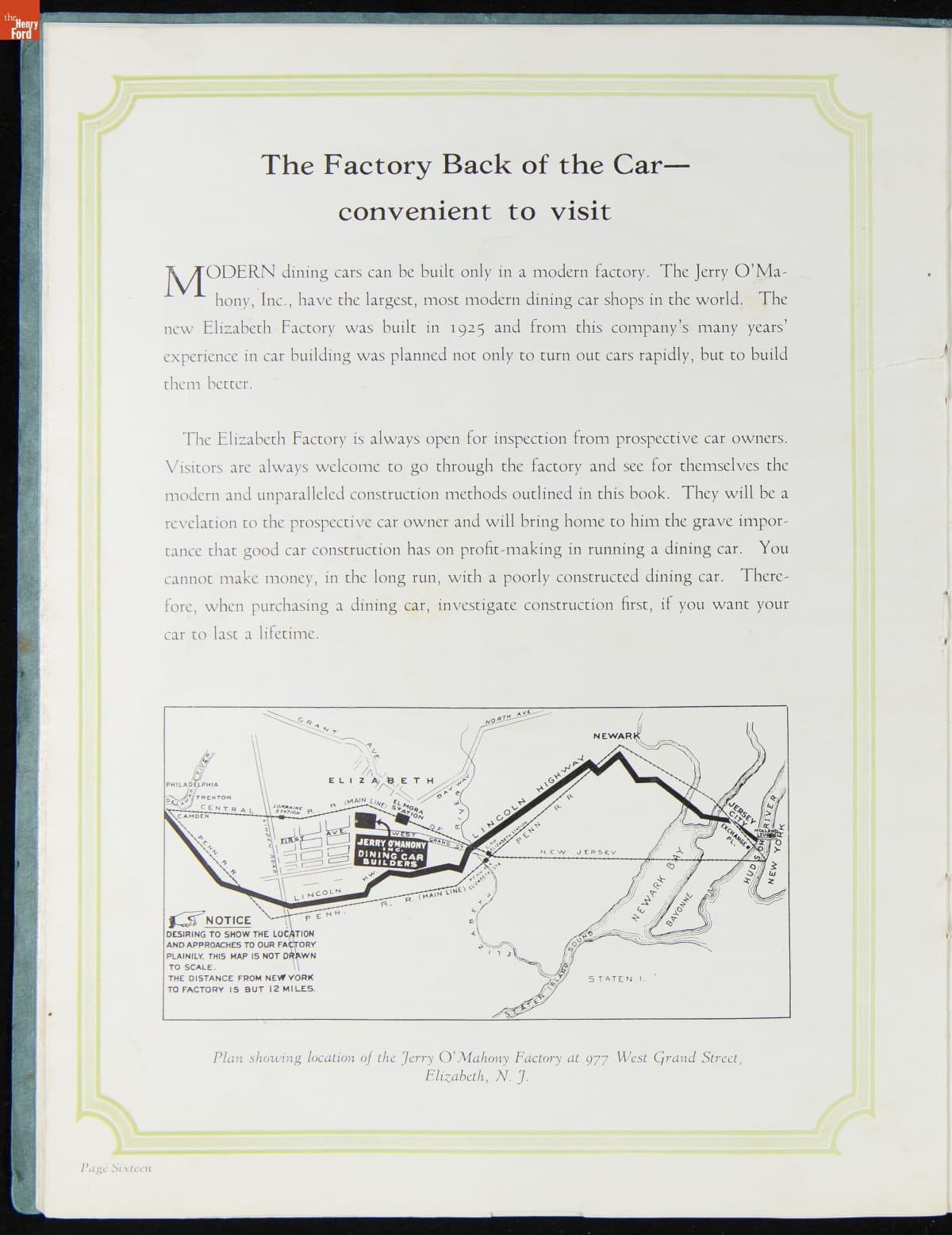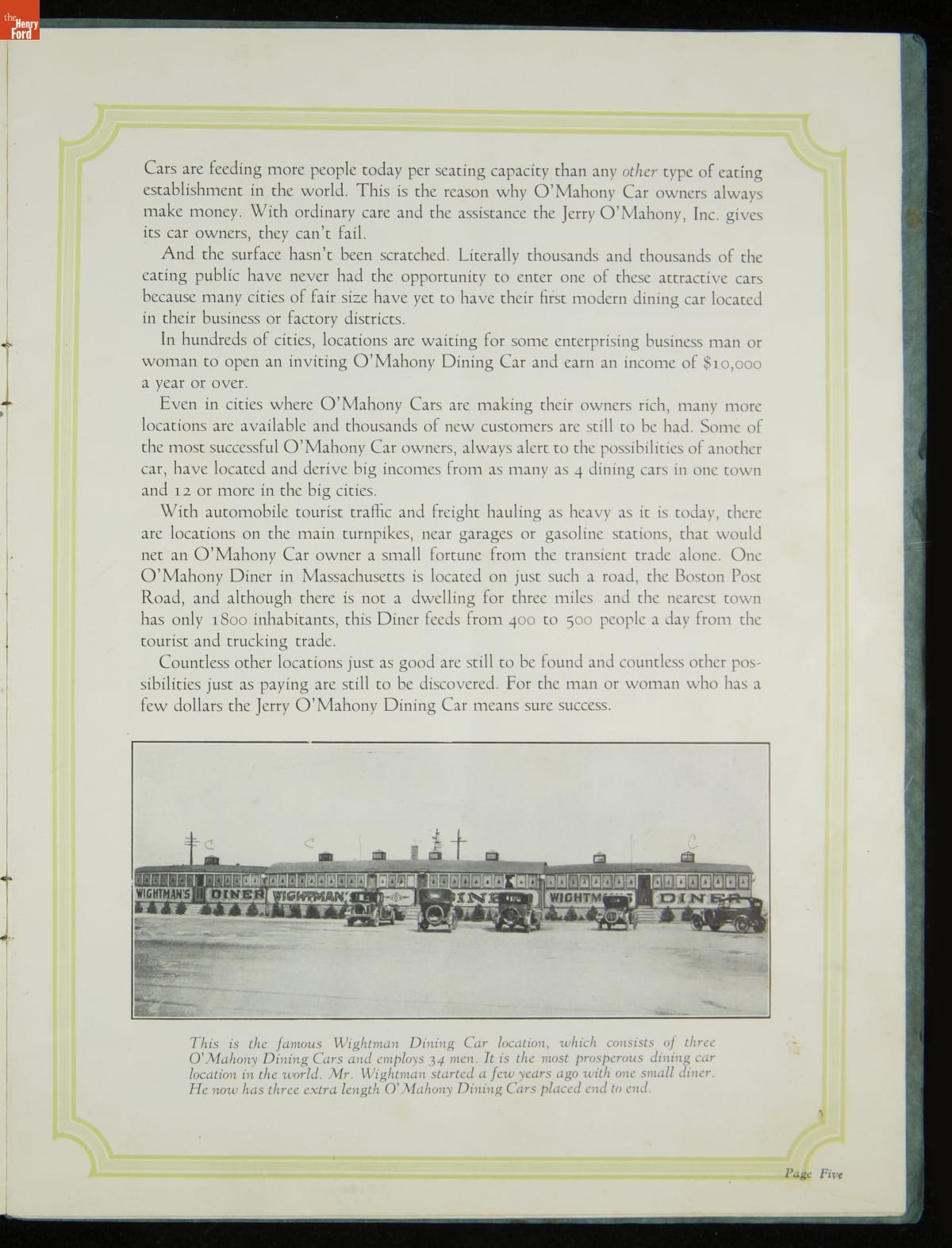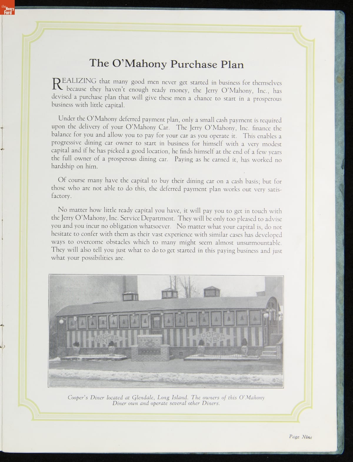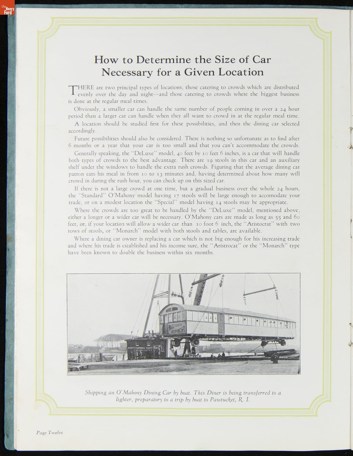 The New Jersey-based Jerry O'Mahony Dining Cars was one of the leading diner manufacturers for decades, building hundreds of diners in numerous styles and giving many diner builders their start. This 1928 catalog features its new steel dining car, the "Monarch," along with its other models and advice to would-be operators.