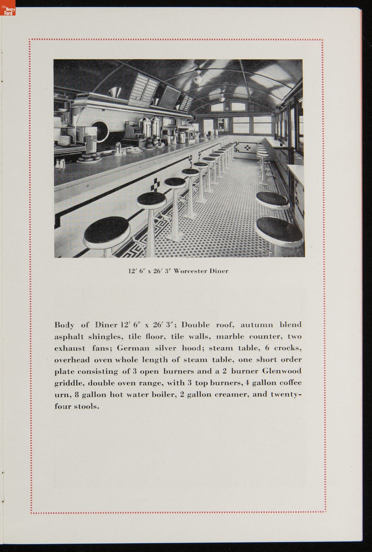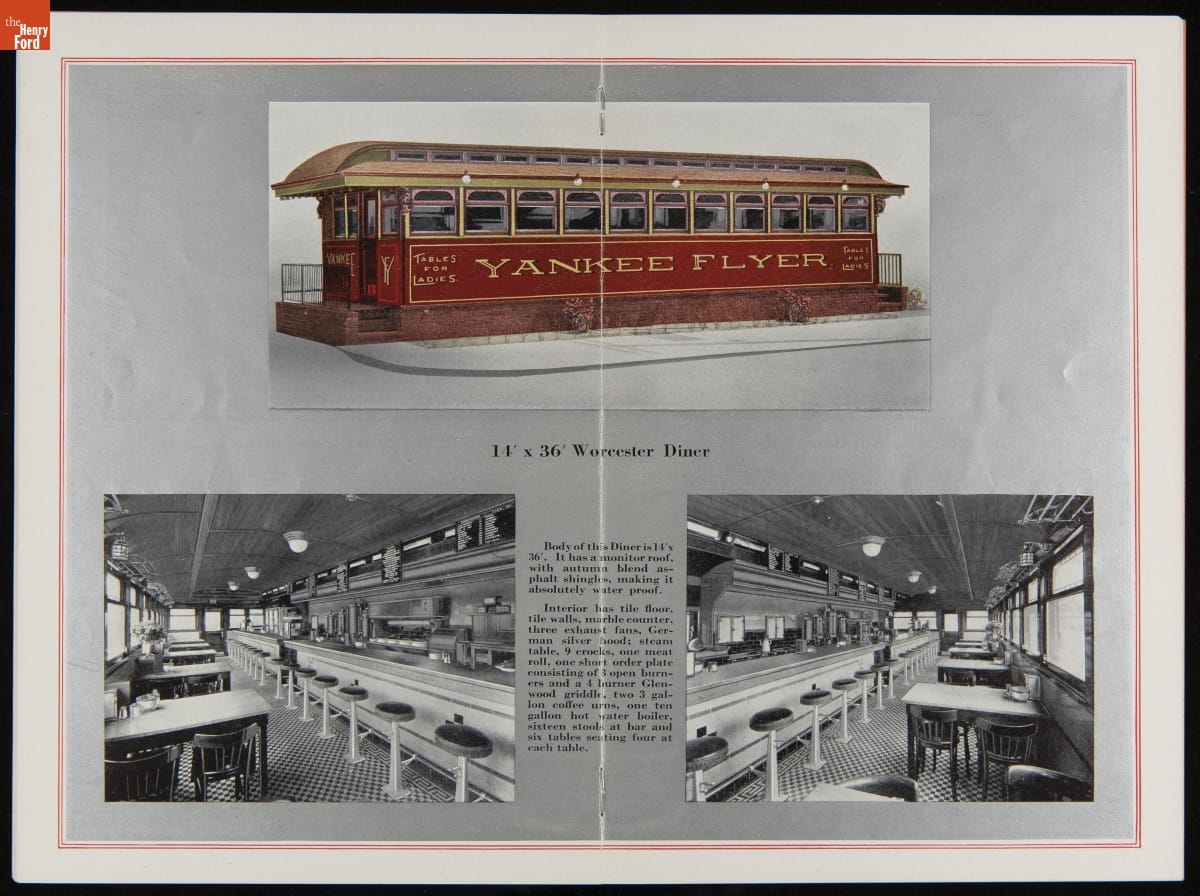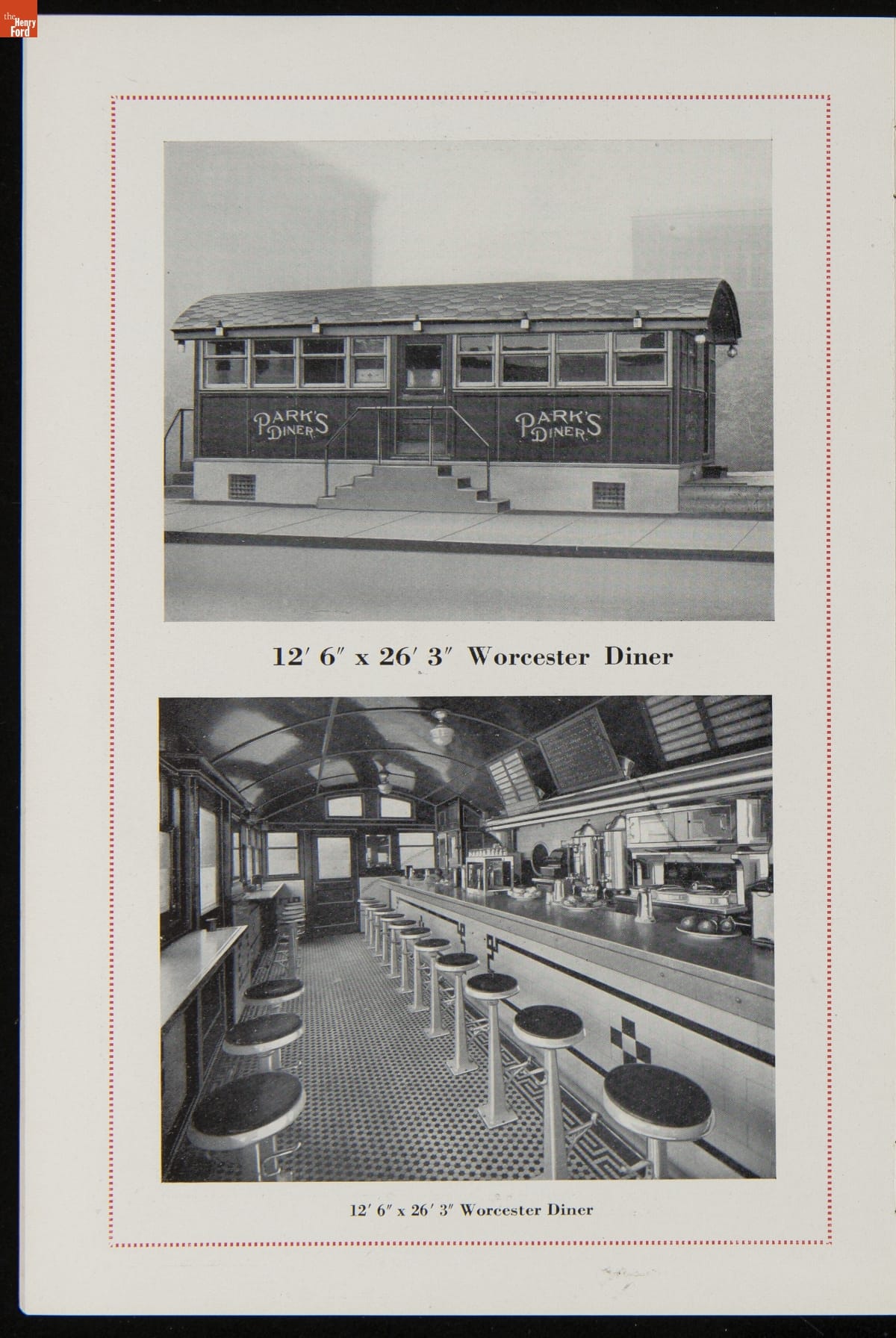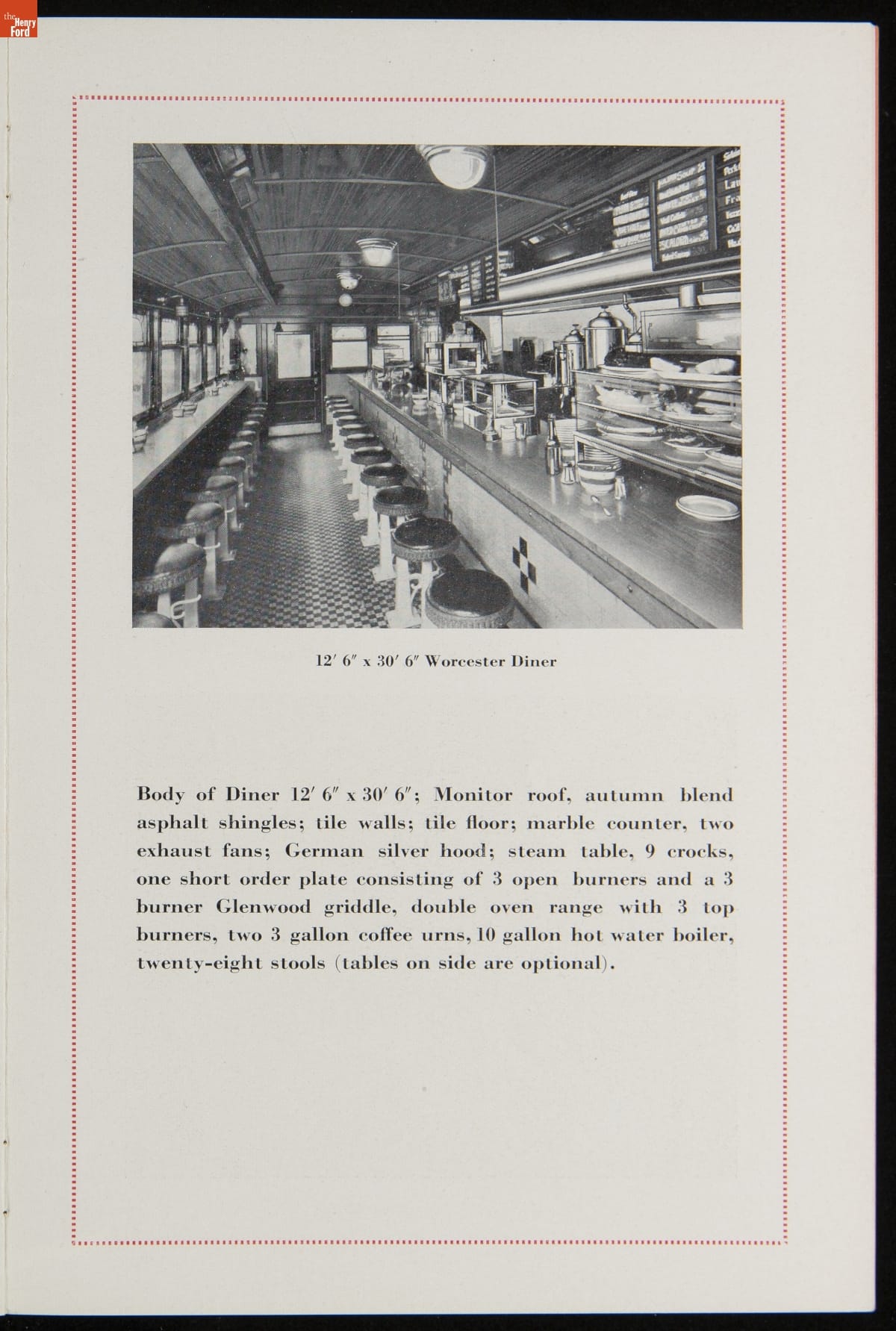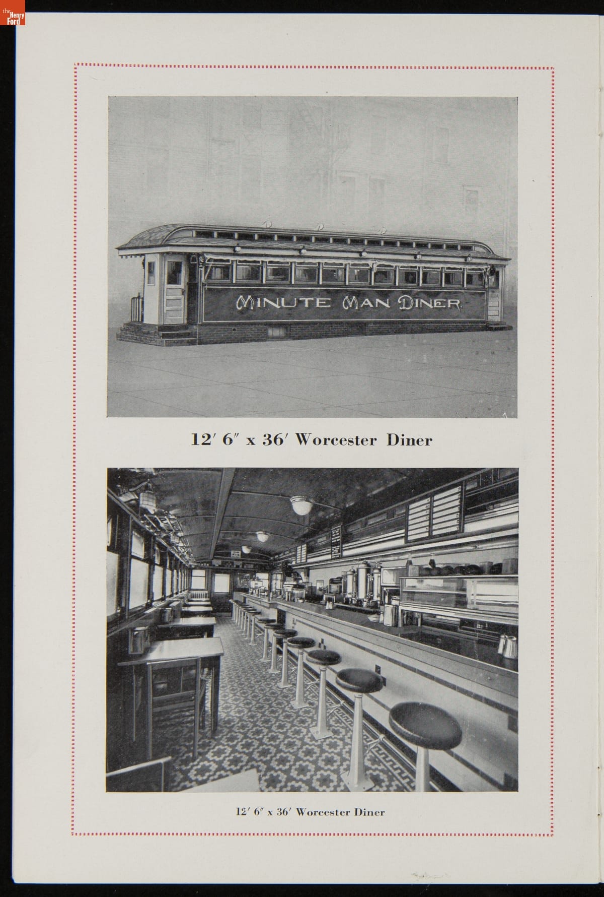 One of New England's premier diner manufacturers, the Worcester Lunch Car Company of Worcester, Massachusetts, began as a lunch wagon builder in 1905. From the mid-1920s to the mid-1950s, this company produced at least seven models of diners, with customizable choices. This 1930-34 catalog was one of only four that the company issued during its existence.