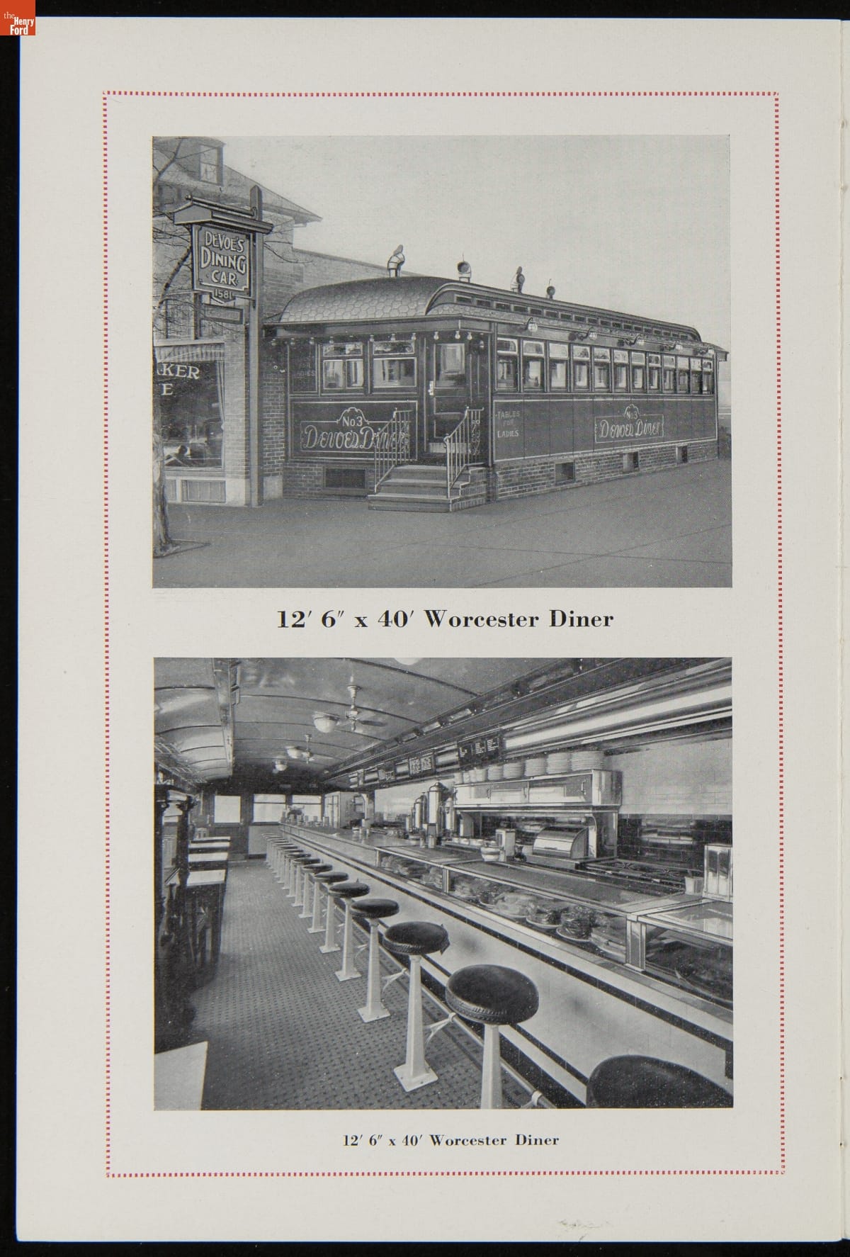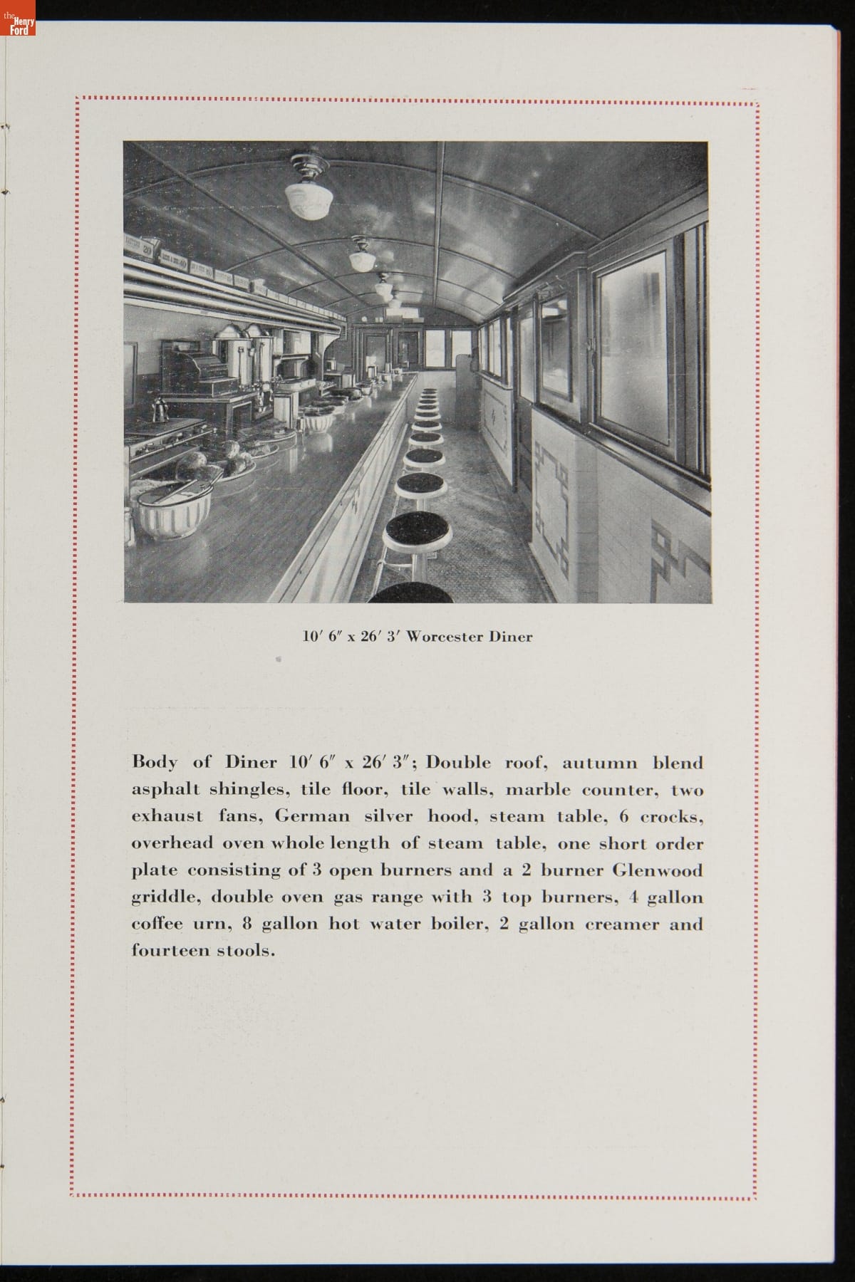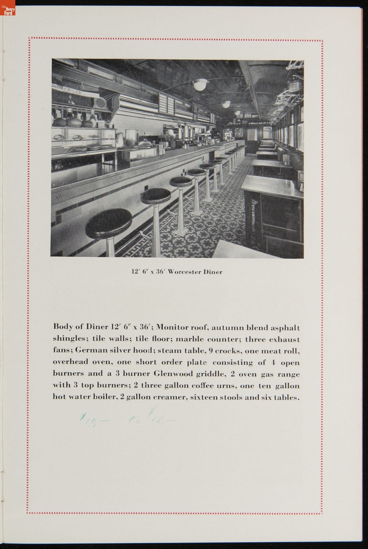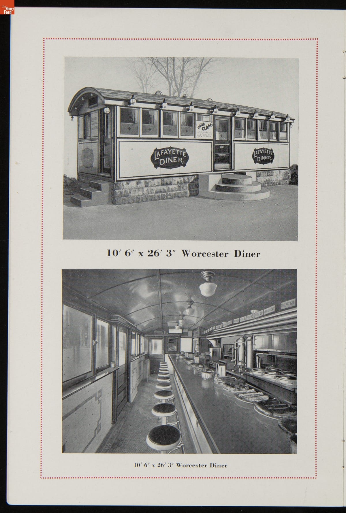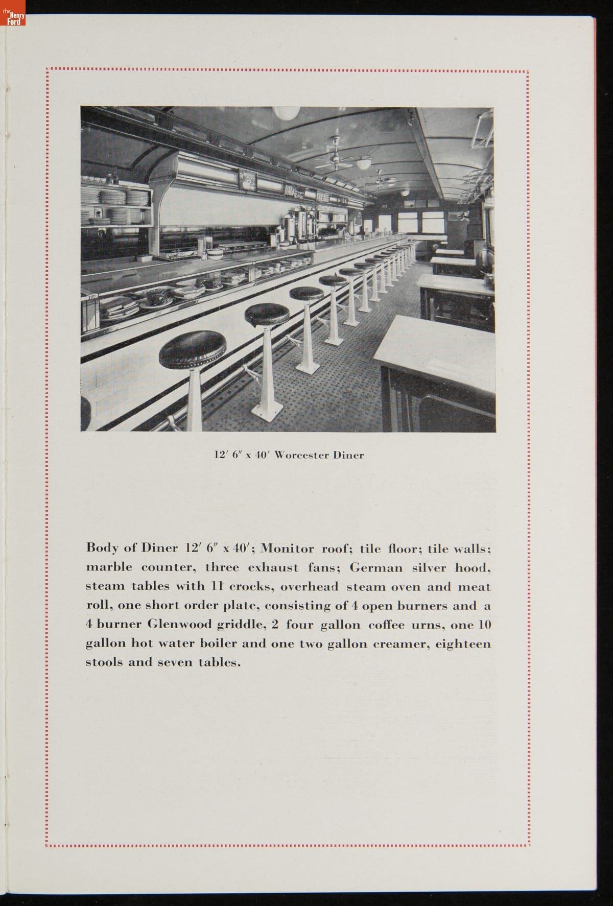 One of New England's premier diner manufacturers, the Worcester Lunch Car Company of Worcester, Massachusetts, began as a lunch wagon builder in 1905. From the mid-1920s to the mid-1950s, this company produced at least seven models of diners, with customizable choices. This 1930-34 catalog was one of only four that the company issued during its existence.