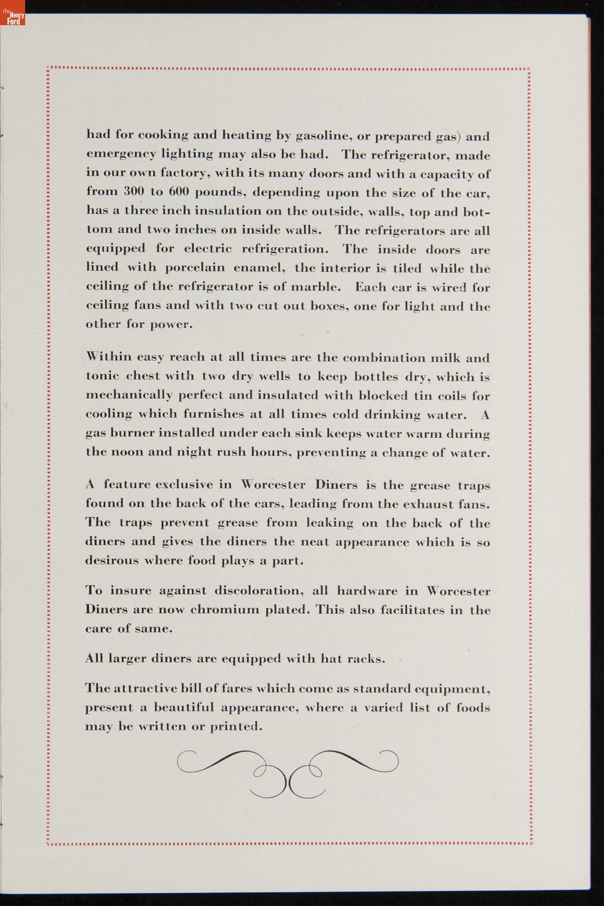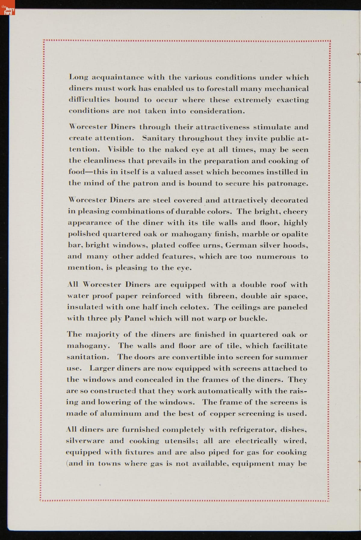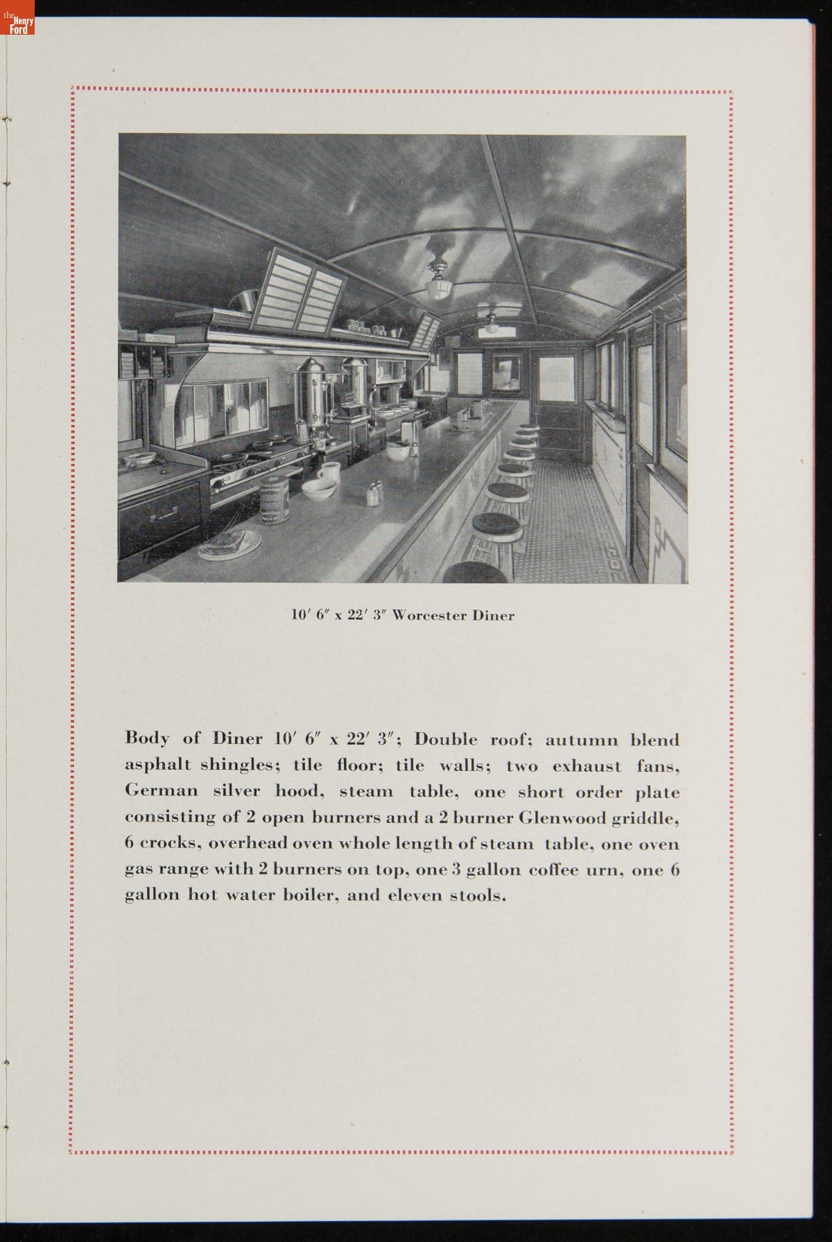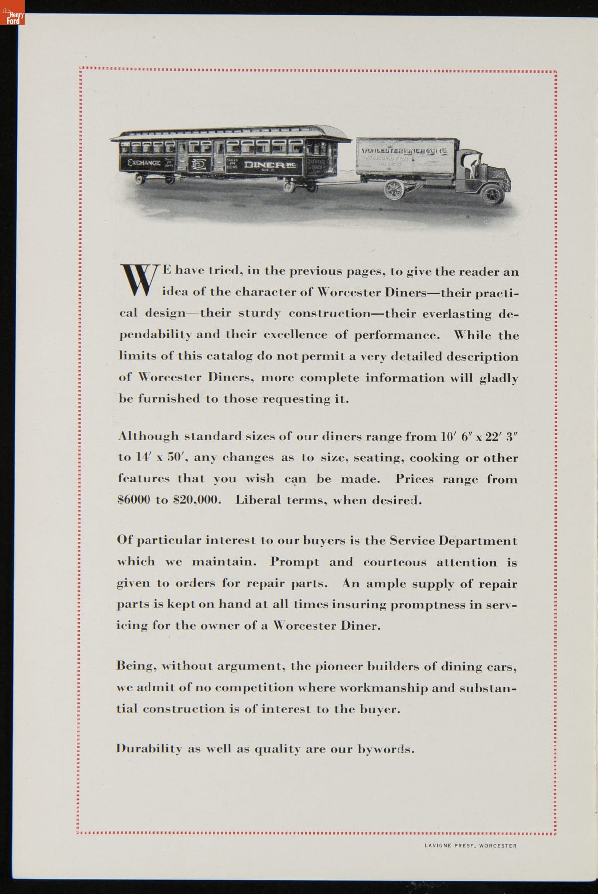One of New England's premier diner manufacturers, the Worcester Lunch Car Company of Worcester, Massachusetts, began as a lunch wagon builder in 1905. From the mid-1920s to the mid-1950s, this company produced at least seven models of diners, with customizable choices. This 1930-34 catalog was one of only four that the company issued during its existence.