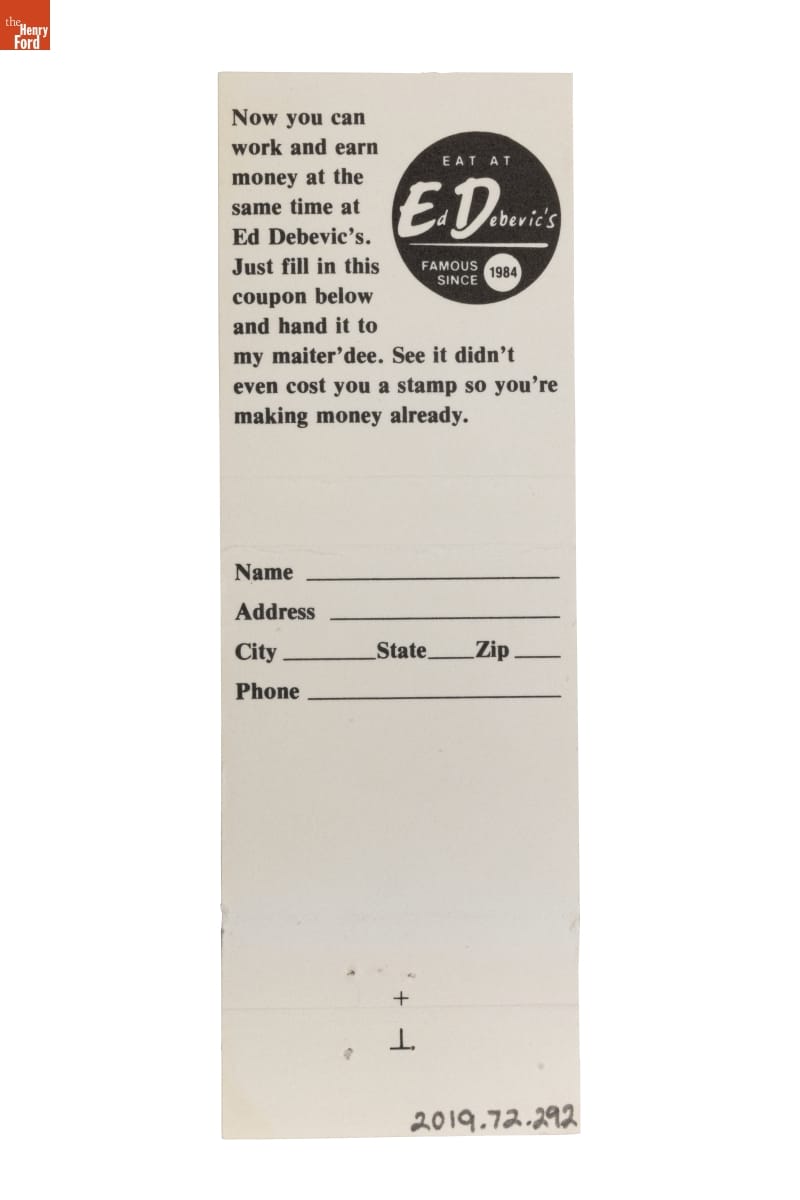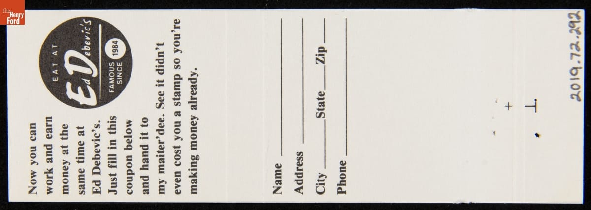 Ed Debevic's Diner Matchbook, 1984-1995