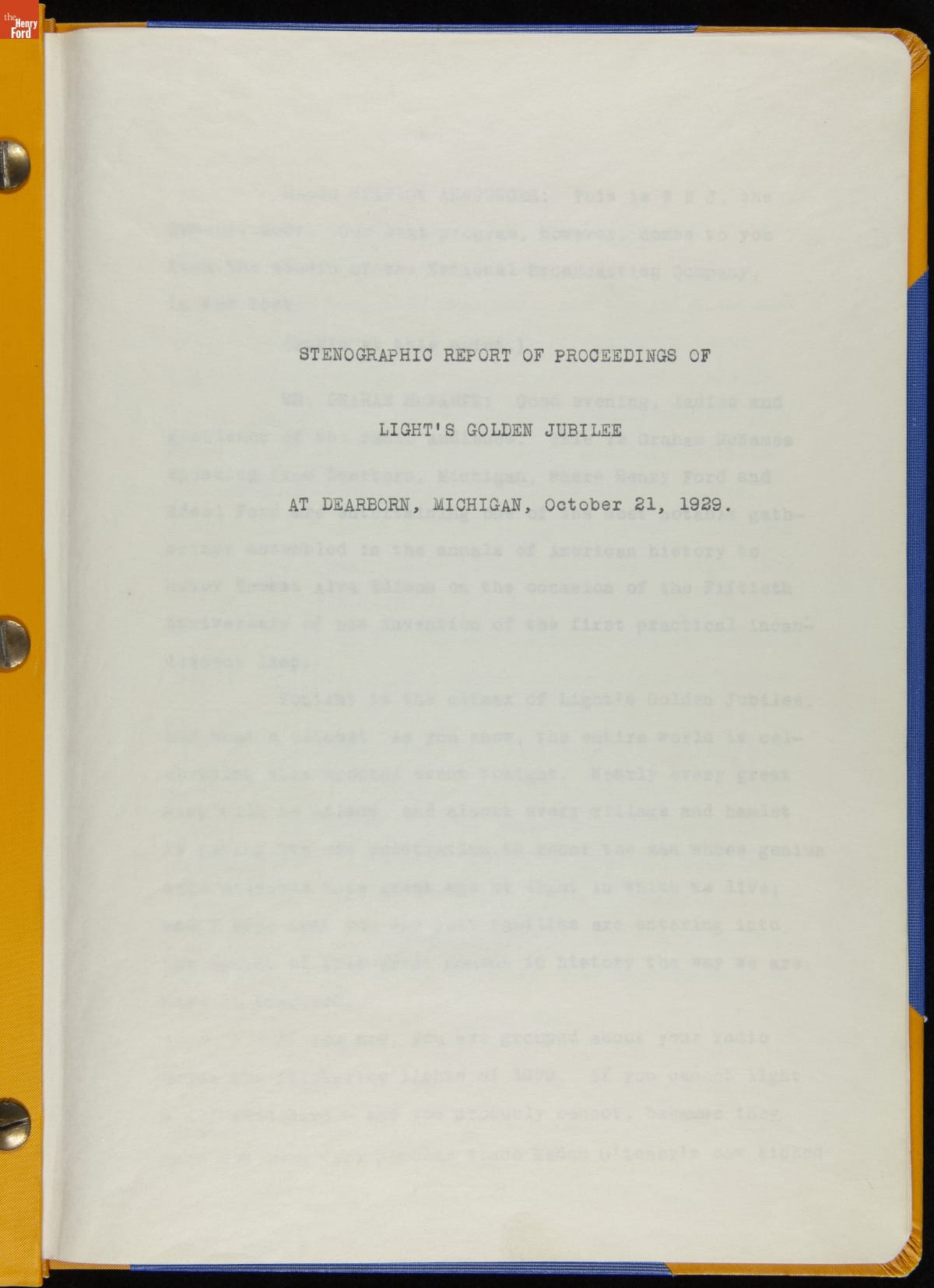 THF277334 / Stenographic Report of Proceedings of Light's Golden Jubilee at Dearborn, Michigan, October 21, 1929 / title page