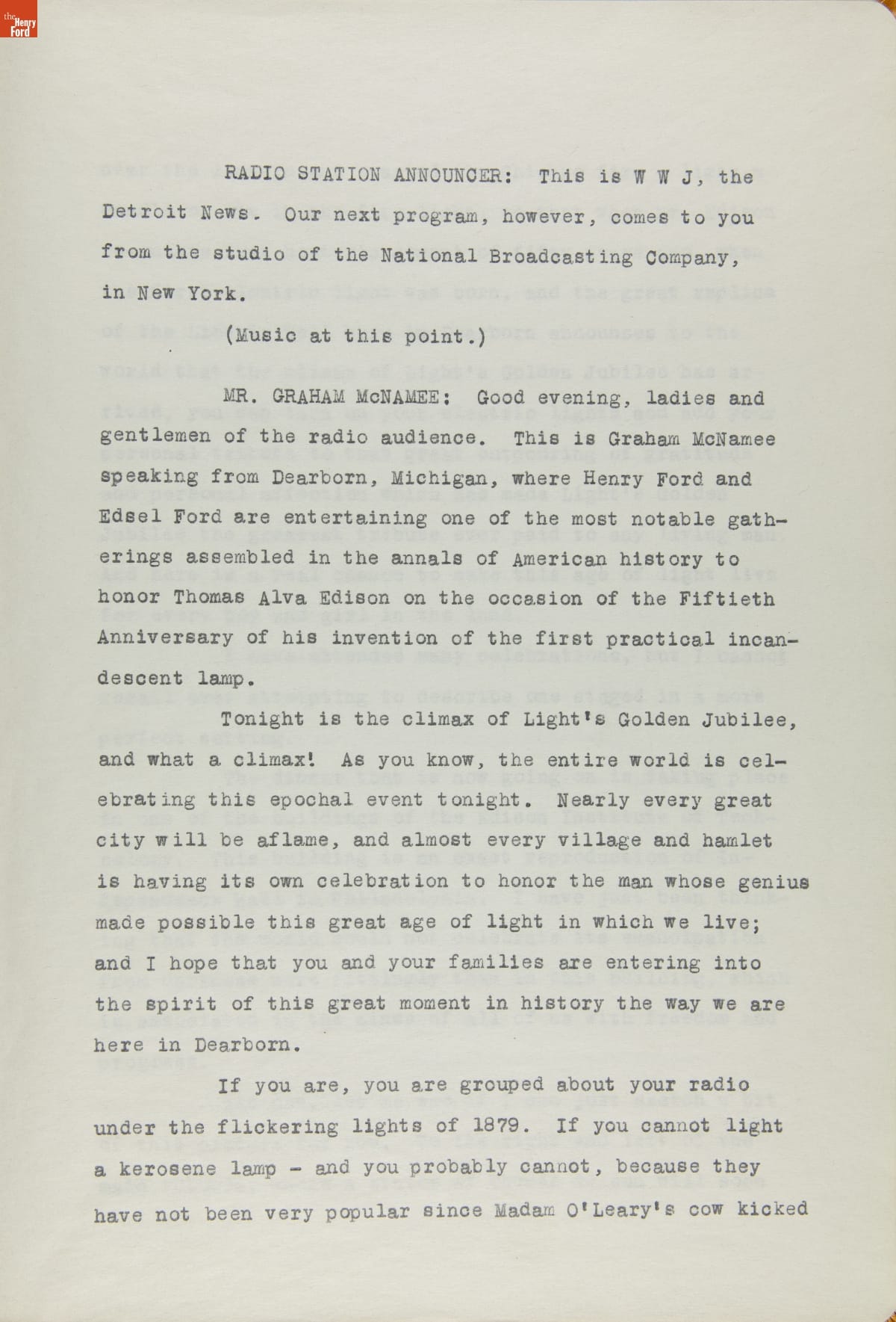 THF277335 / Stenographic Report of Proceedings of Light's Golden Jubilee at Dearborn, Michigan, October 21, 1929 / page1