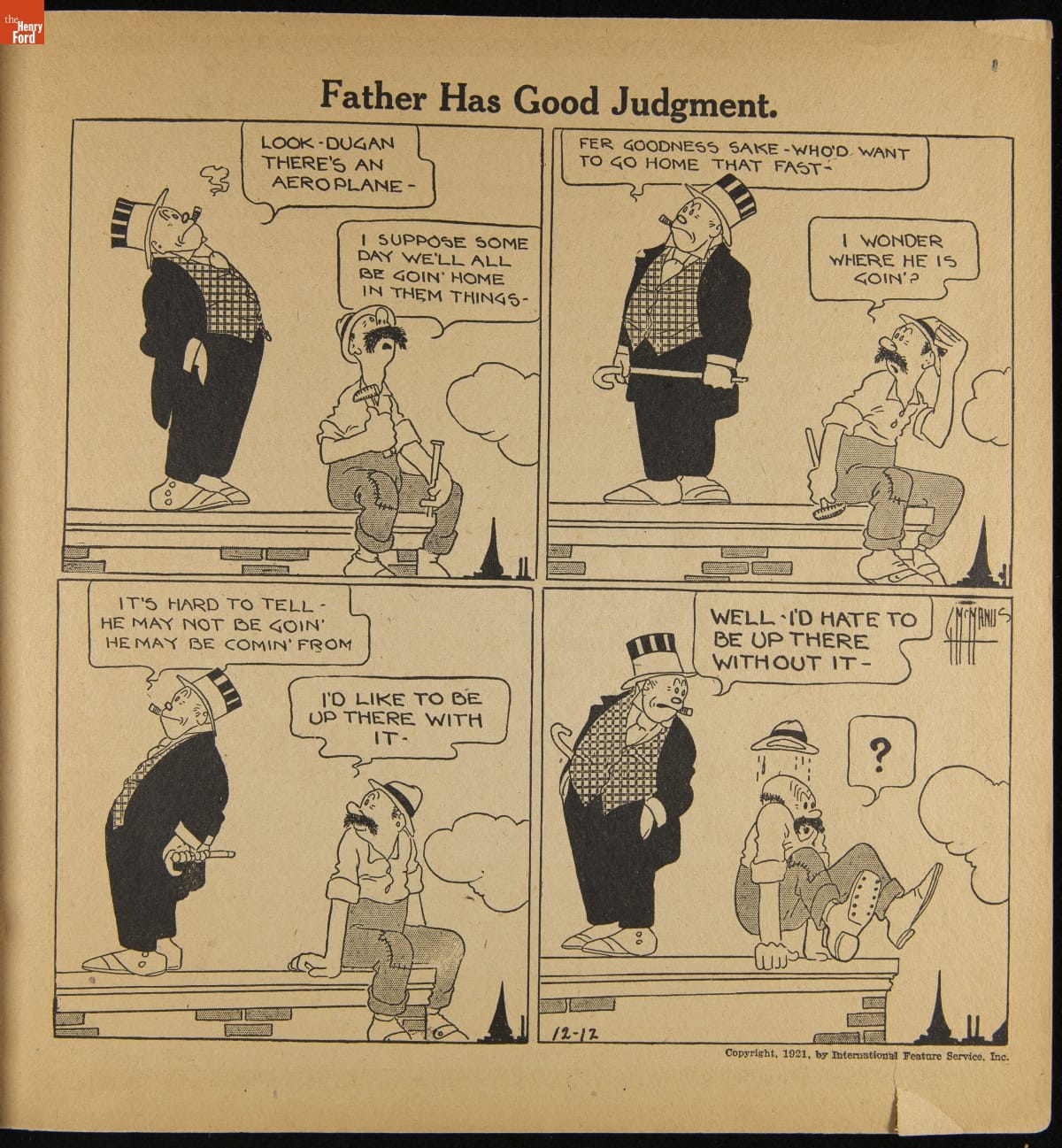 George McManus, a son of Irish immigrants, created the American syndicated comic strip Bringing Up Father in 1913. The strip follows the Irish working-class immigrant Jiggs and his wife, Maggie, as they navigate new-found wealth. McManus infused his strip with nuanced meanings, playing on early 20th-century themes of ethnic stereotyping and immigrant assimilation, the accumulation of wealth, social striving, and the American work ethic.
