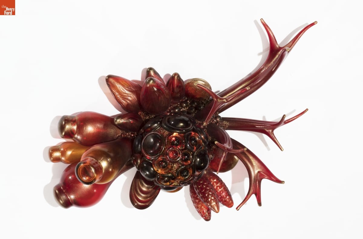 Robin Cass teaches glass at the Rochester Institute of Technology. According to the artist, this is the first piece in a new series that will contemplate on post-industrial nostalgia, resilience, and hope. Cass used Greenfield Village glass shop's "brake-light" ruby glass, blowing it into lightbulb and automobile lens molds, as well as using automobile spray and detailing paints.