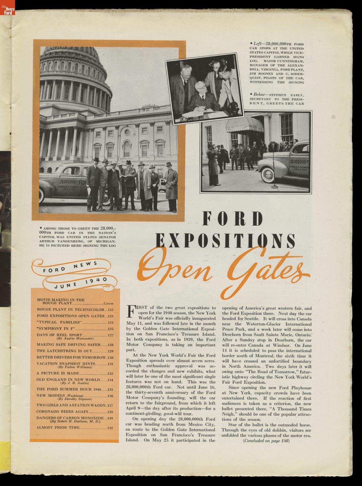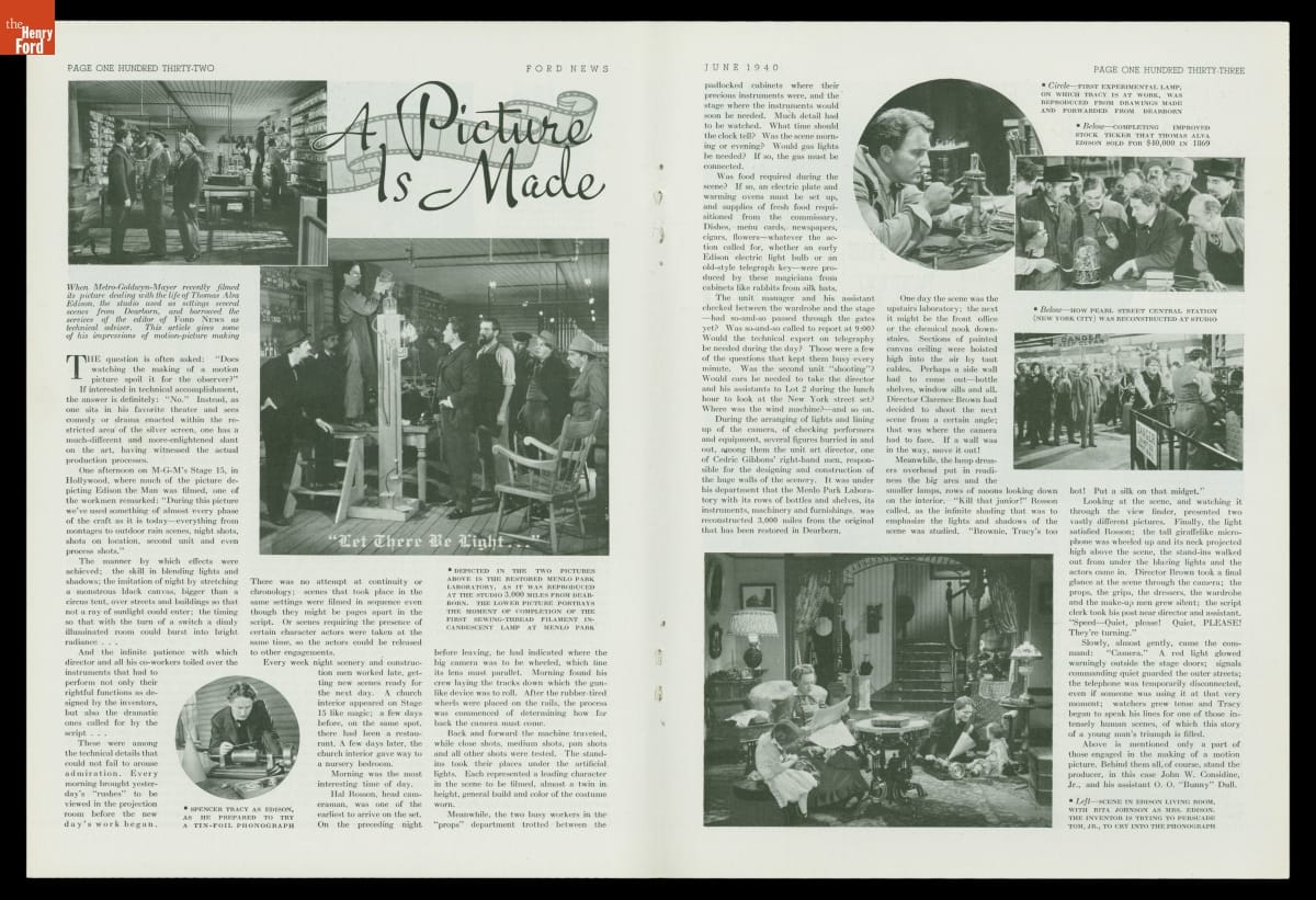 Ford Motor Company published Ford News from 1920 to 1942. The magazine kept employees and dealers informed on the automaker's products and activities. Each issue contained general-interest stories as well. The June 1940 edition included a story on the making of MGM's film Edison, the Man starring Spencer Tracy as Thomas Edison.