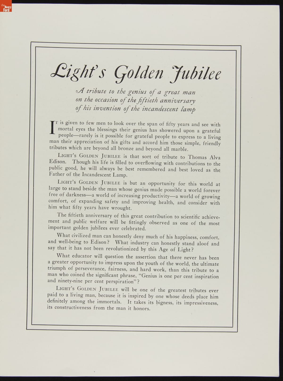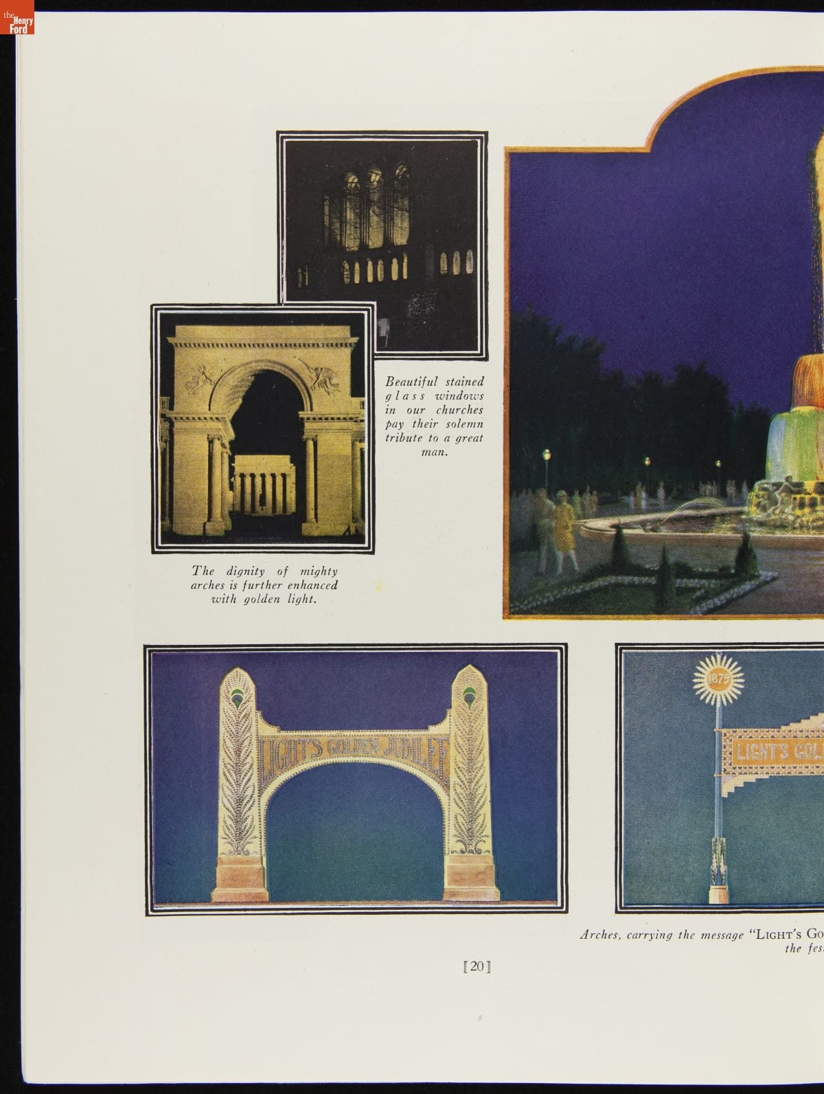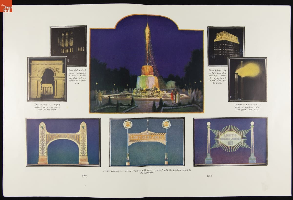 In 1929, communities throughout America planned Light's Golden Jubilee celebrations to commemorate the 50th anniversary of Thomas Edison's invention of the incandescent lamp. This publication gave suggestions on how to decorate city streets, store fronts, parks and other public areas, as well as provided a list of materials and souvenirs available from suppliers.