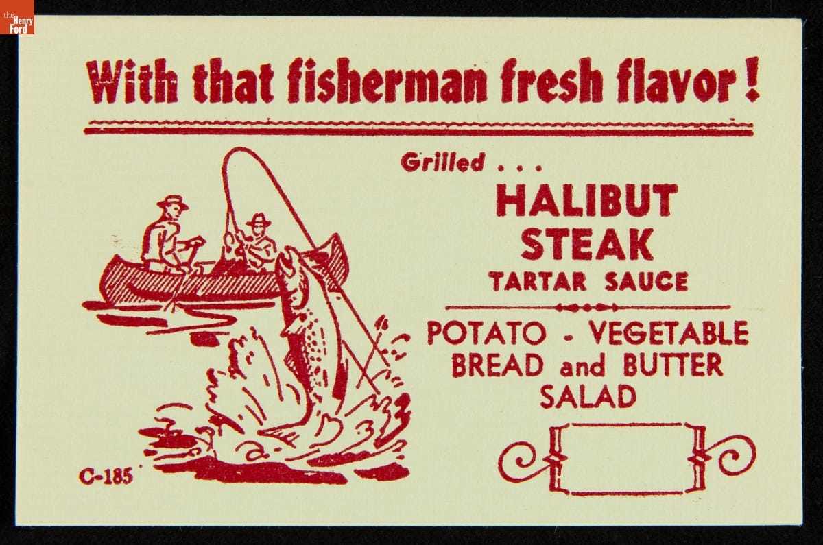 Menu-Insert Card, "With That Fisherman Fresh Flavor! Grilled Halibut Steak Tartar Sauce," 1950-1970