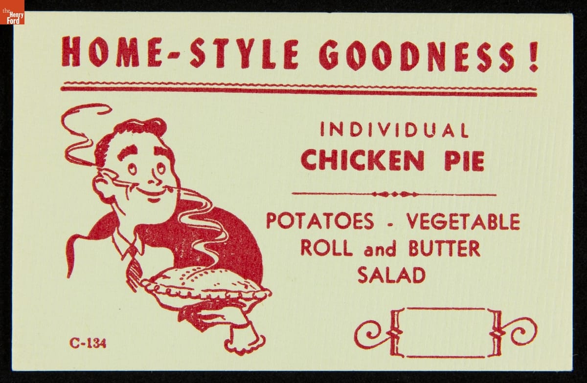 Menu-Insert Card, "Home-Style Goodness! Individual Chicken Pie," 1950-1970