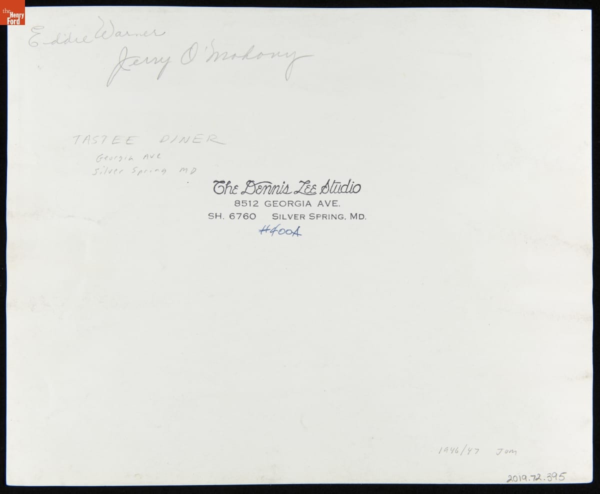 Eddie Warner / Jerry O'Mahony / Tastee Diner / Georgia Ave / Silver Spring MD / The Dennis Lee Studio / 8512 Georgia Ave. / SH. 6760 Silver Spring, MD. / #400A / 1946/47 JOM
