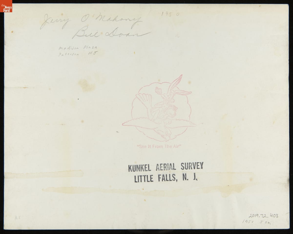 Jerry O'Mahony / [?] / 1950 / Madison Plaza / Paterson NJ / "See It From The Air" / Kunkyl Aerial Survey / Little Falls, N. J. / 1950 JOM