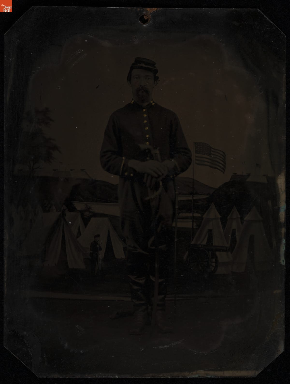 Cavalryman with a Painted Backdrop of a Military Camp, 1860-1869
