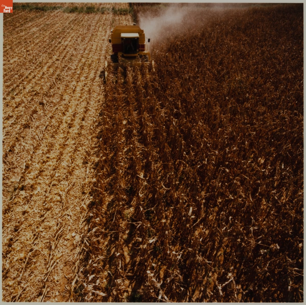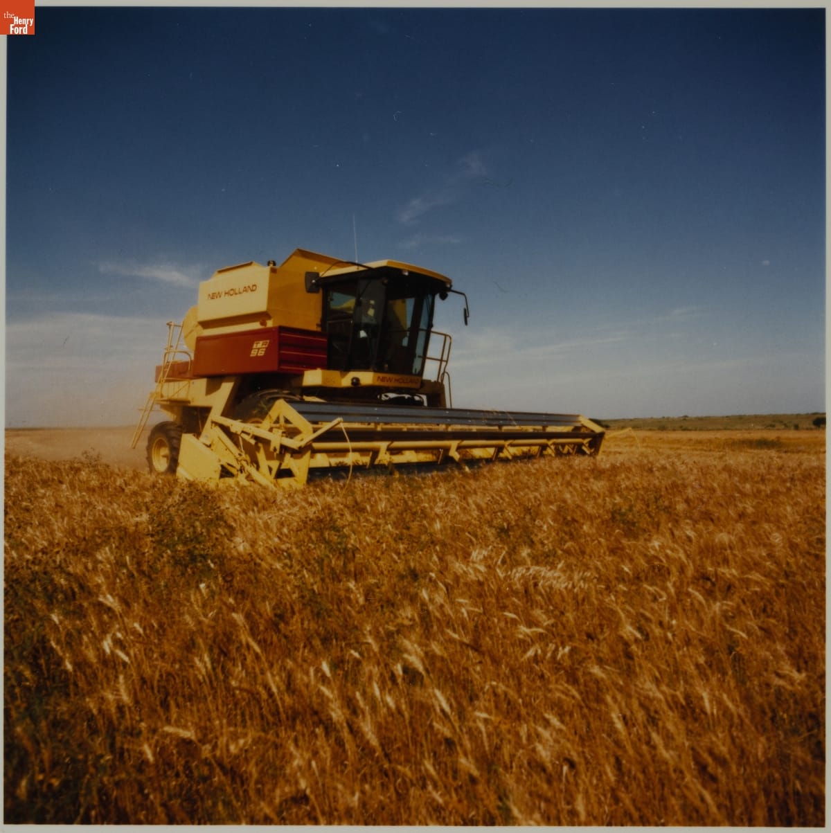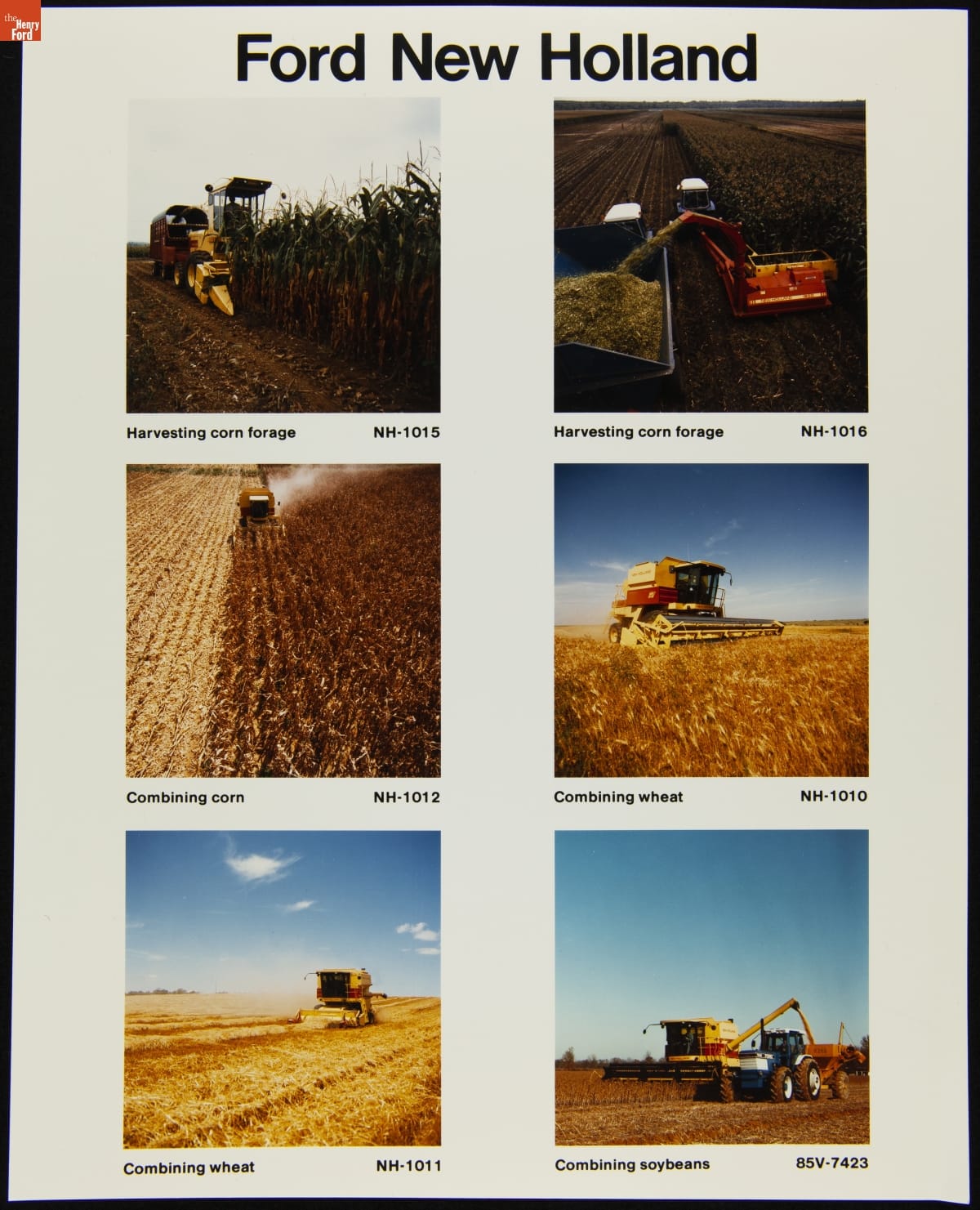 American soybean production increased rapidly from the late 1970s into the 1980s, prompting manufacturers to invest in the research and development of specialized agricultural equipment. This 1985 photograph promotes a range of Ford New Holland machinery built to harvest corn and wheat -- crops that had been common for many decades -- as well as the relative newcomer, soybeans.