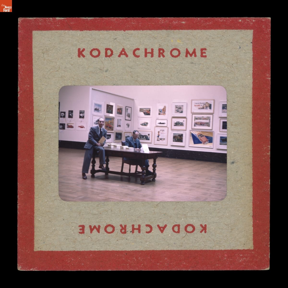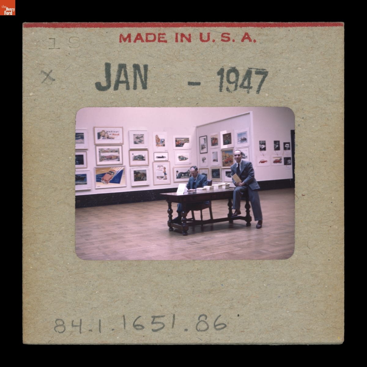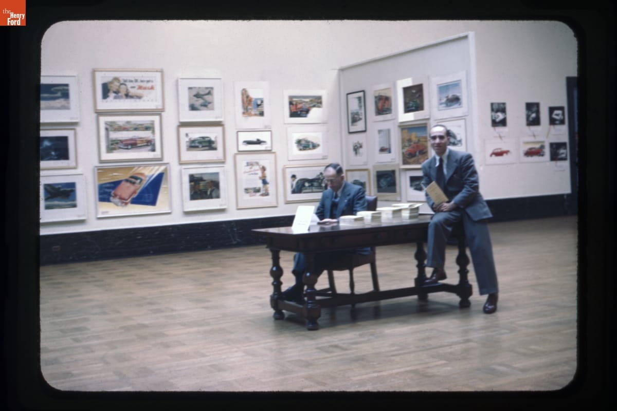 Designer John Najjar (right) was photographed with a colleague in January 1947 at the Detroit Institute of Arts, where the two men were surrounded by automotive art and advertisements. Established in 1885, the DIA grew into one of the most important art museums in the United States.