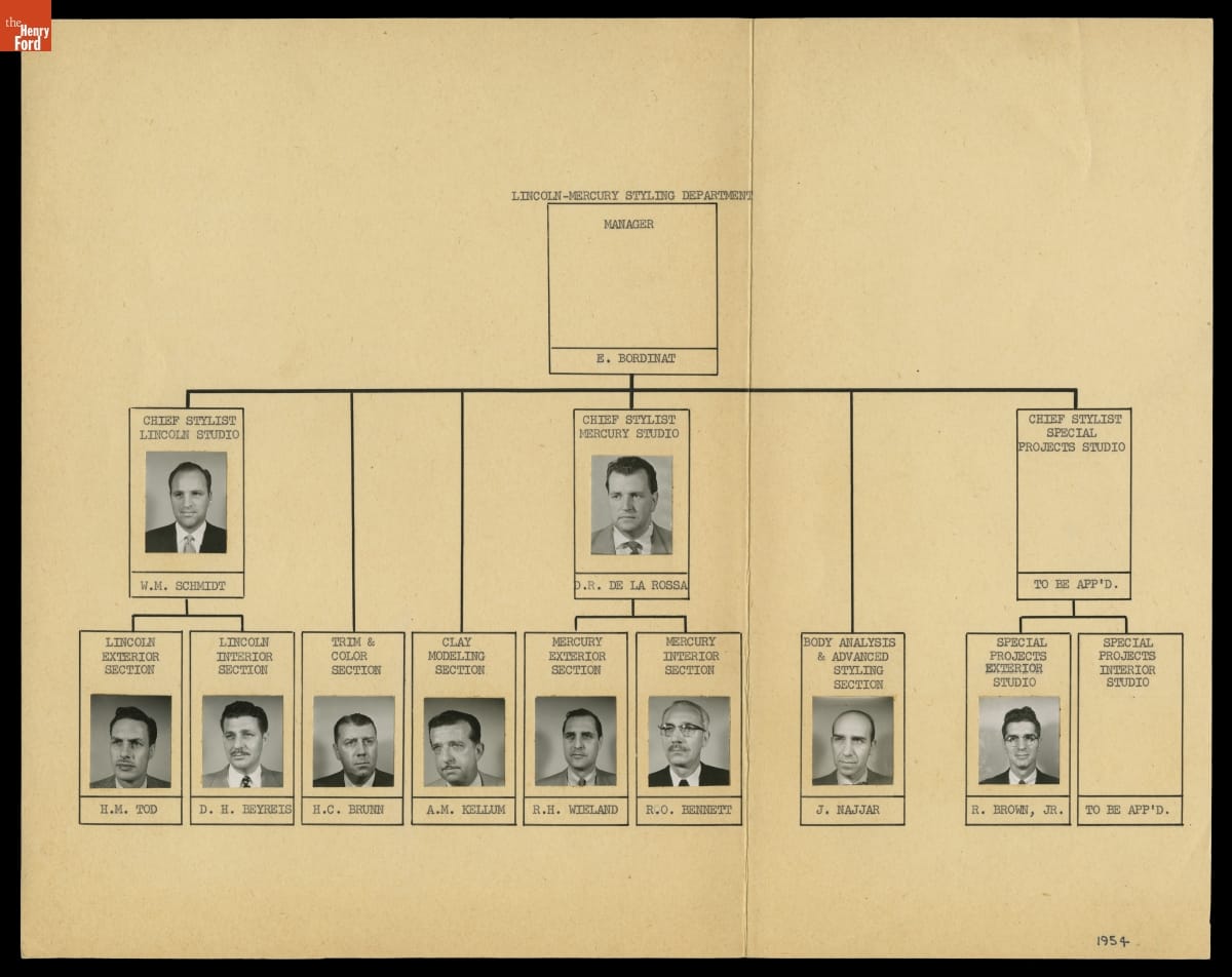This organizational chart illustrated the hierarchy at Ford Motor Company's Lincoln-Mercury Styling Department in 1954. Eugene Bordinat directed the department from 1954-1961. William Schmidt served as Lincoln's chief designer from 1947-1954. Don DeLaRossa headed Mercury's design efforts from 1952-1955. The chart is from the papers of designer John Najjar, who spent more than 40 years at Ford Motor Company.