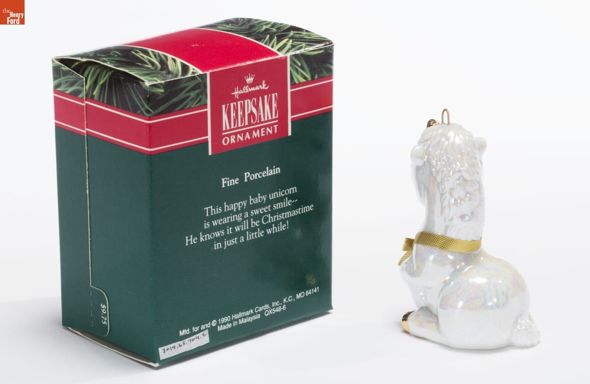 Hallmark / KEEPSAKE / ORNAMENT / Fine Porcelain / This happy baby unicorn / is wearing a sweet smile-- / He knows it will be Christmastime / in just a little while! / Mfd. for and (C) 1990 Hallmark Cards, Inc., K.C., MO 64141 / Made in Malaysia QX548-6
