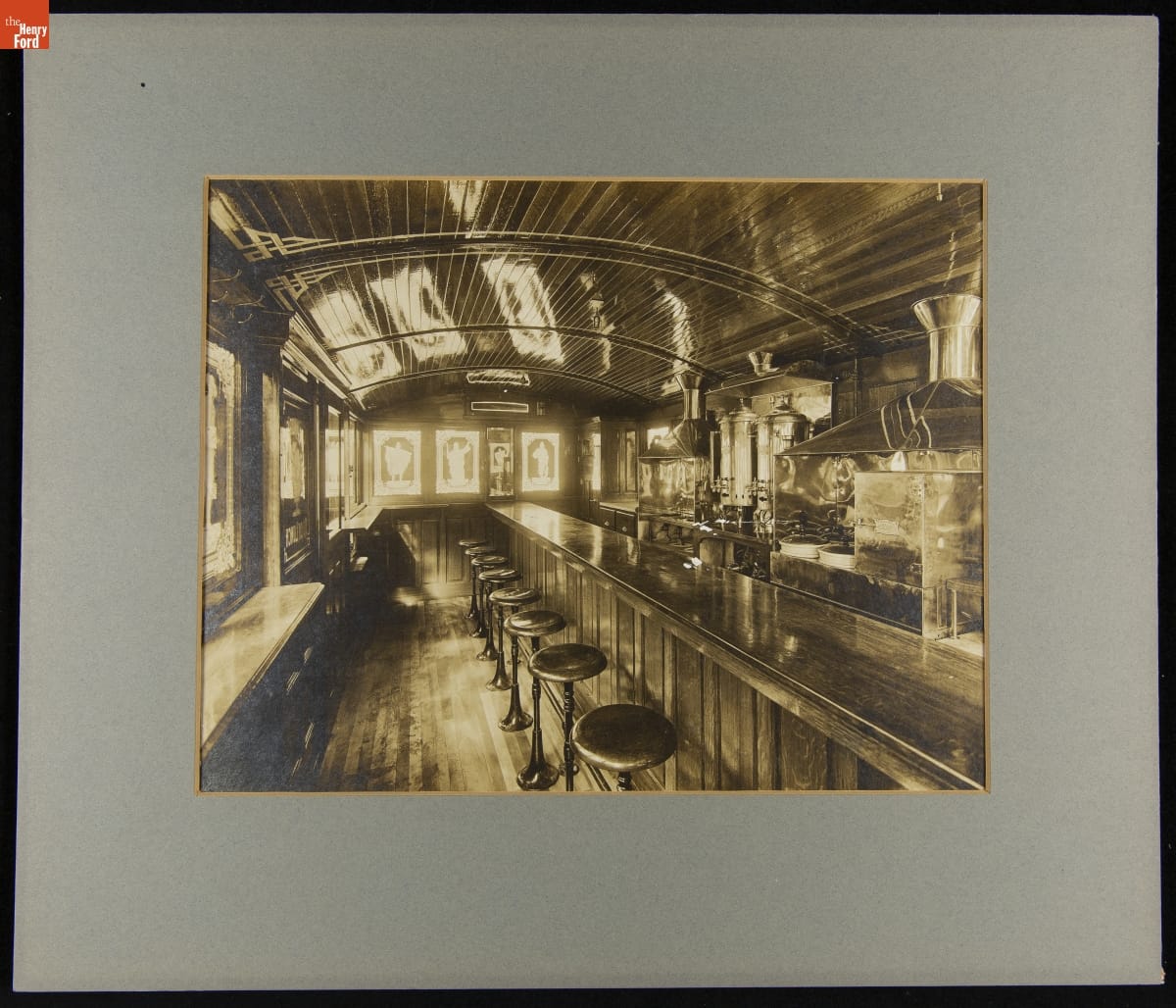 Diners trace their origins to horse-drawn lunch wagons, that appeared on city streets at night to feed workers. One of New England's premier diner builders, the Worcester Lunch Car Company of Worcester, Massachusetts, began producing lunch wagons in 1906. This 1910 photograph shows an interior view of the Central Lunch Wagon manufactured by this company.