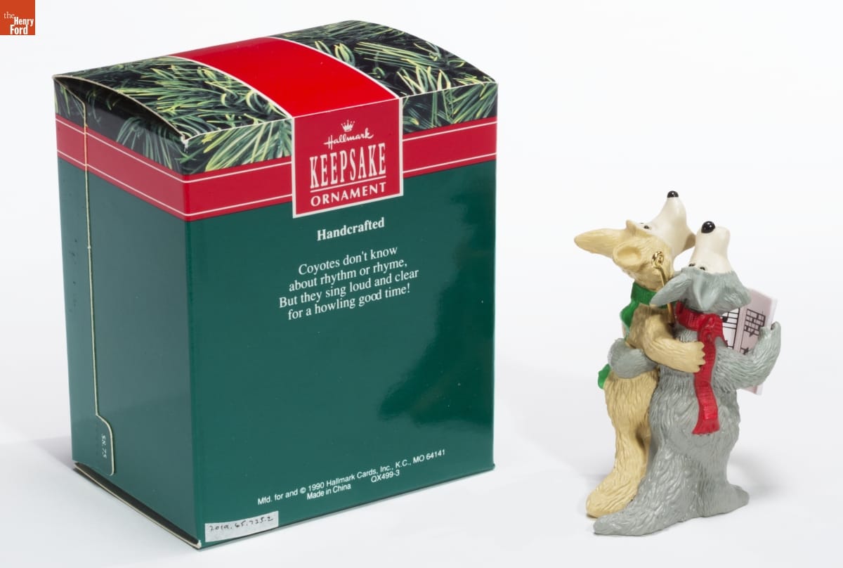 Hallmark / KEEPSAKE / ORNAMENT / Handcrafted / Coyotes don't know / about rhythm or rhyme, / But they sing loud and clear / for a howling good time! / Mfd. for and (C) 1990 Hallmark Cards, Inc., K.C., MO 64141 / Made in China QX499-3