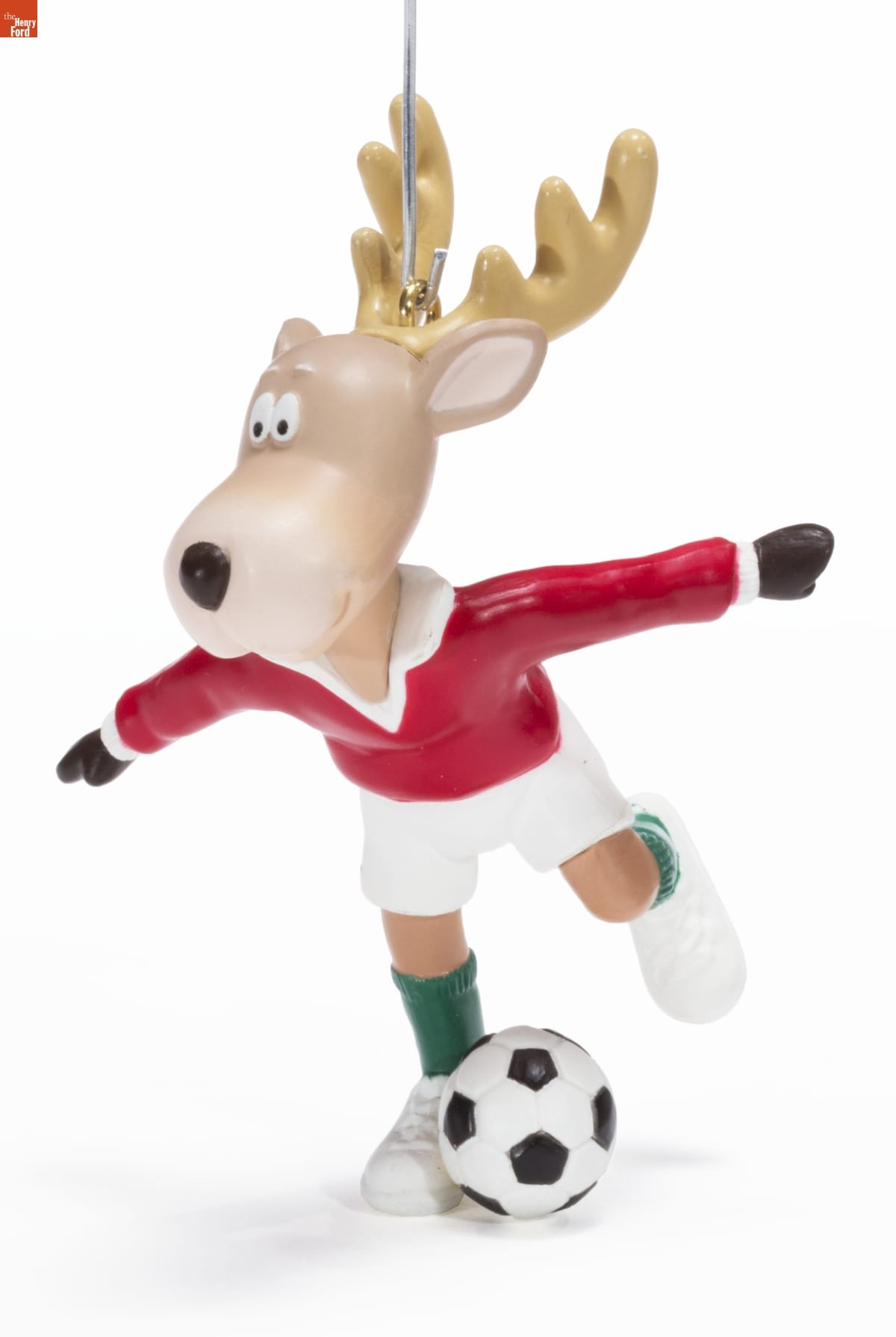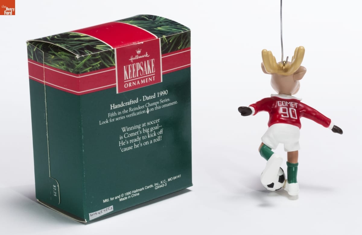 Hallmark / KEEPSAKE / ORNAMENT / Handcrafted - Dated 1990 / Fifth in the Reindeer Champs Series. / Look for series verification 5 on this ornament. / Winning at soccer / is Comet's big goal-- / He's ready to kick off / 'cause he's on a roll! / Mfd. for and (C) 1990 Hallmark Cards, Inc., K.C., MO 64141 / Made in China QX443-3