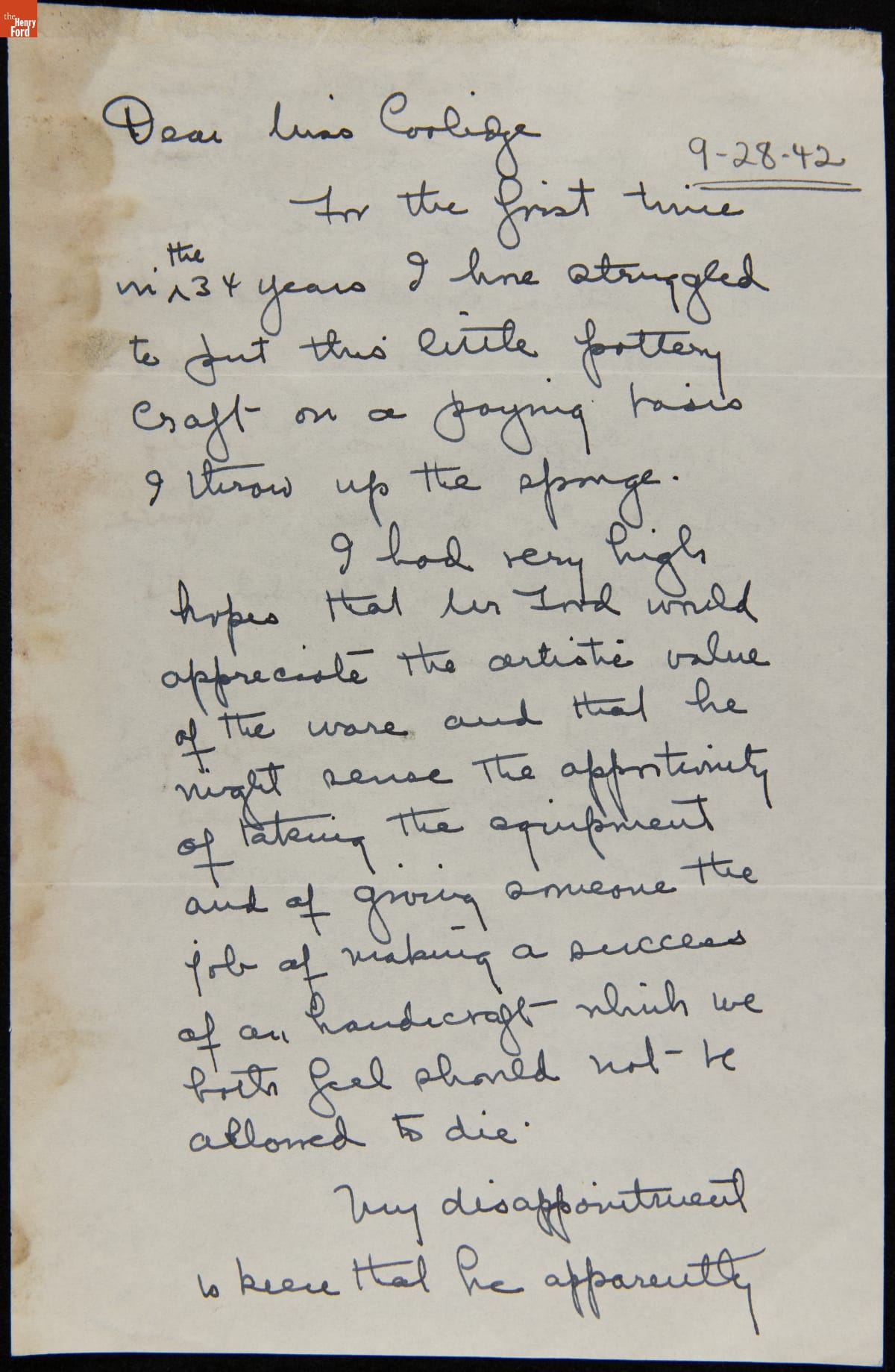 Correspondence between Edith Guerrier, Frank Campsall, R.J. Sennott, and Rosamond Coolidge regarding the Paul Revere Pottery, 1937-1942