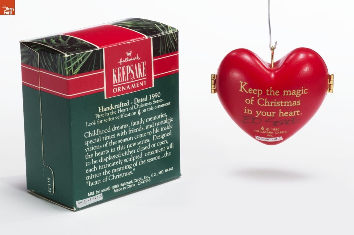 Hallmark / KEEPSAKE / ORNAMENT / Handcrafted - Dated 1990 / First in the Heart of Christmas Series. / Look for series verification 1 on this ornament. / Childhood dreams, family memories, / special times with friends, and nostalgic / visions of the season come to life inside / the hearts in this new series. Designed / to be displayed either closed or open, / each intricately sculpted ornament will / mirror the meaning of the season...the / "heart of Christmas." / Mfd. for and (C) 1990 Hallmark Cards, Inc., K.C., MO 64141 / Made in China QX472-6