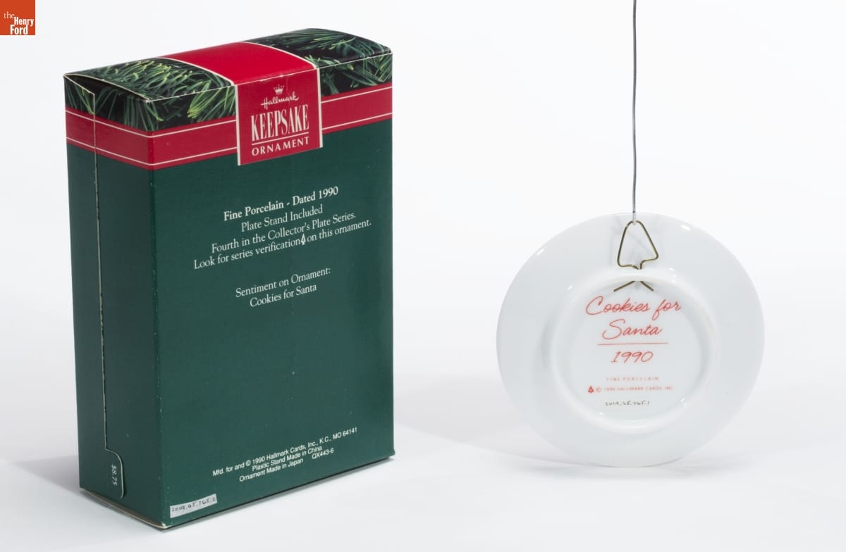 Hallmark / KEEPSAKE / ORNAMENT / Fine Porcelain - Dated 1990 / Plate Stand Included / Fourth in the Collector's Plate Series. / Look for series verification 4 on this ornament. / Sentiment on Ornament: / Cookies for Santa / Mfd. for and (C) 1990 Hallmark Cards, Inc., K.C., MO 64141 / Plastic Stand Made in China / Ornament Made in Japan QX443-6