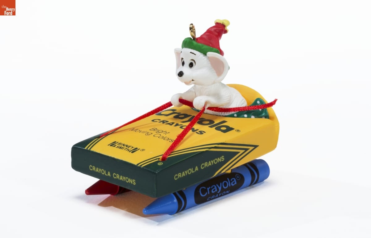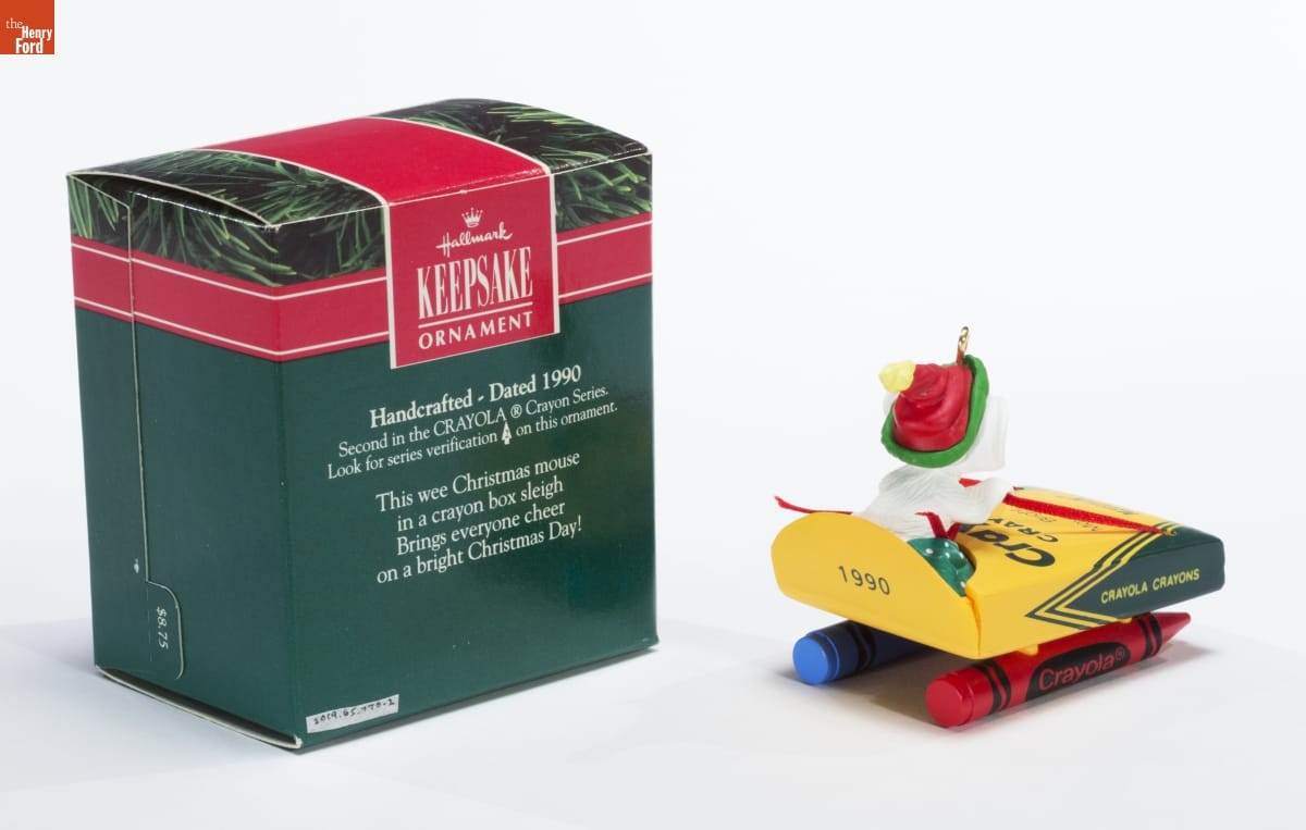 Hallmark / KEEPSAKE / ORNAMENT / Handcrafted - Dated 1990 / Second in the CRAYOLA (R) Crayon Series. / Look for series verification 2 on this ornament. / This wee Christmas mouse / in a crayon box sleigh / Brings everyone cheer / on a bright Christmas Day!