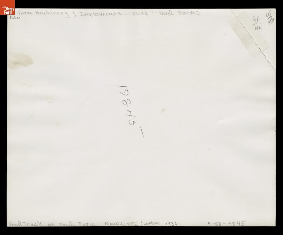 Henry Ford acquired thousands of acres of farmland in southeast Michigan, collectively known as the Ford Farms. Much of the Farms' acreage was dedicated to one of Ford's agricultural interests at that time: soybeans. This 1936 image shows a combine, dump truck, and worker during a soybean harvest in Macon, Michigan.