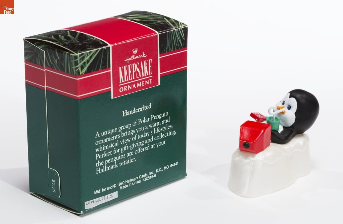 Hallmark / KEEPSAKE / ORNAMENT / Handcrafted / A unique group of Polar Penguin / ornaments brings you a warm and / whimsical view of today's lifestyles. / Perfect for gift-giving and collecting, / the penguins are offered at your / Hallmark retailer. / Mfd. for and (C) 1990 Hallmark Cards, Inc., K.C., MO 64141 / Made in China QX516-6