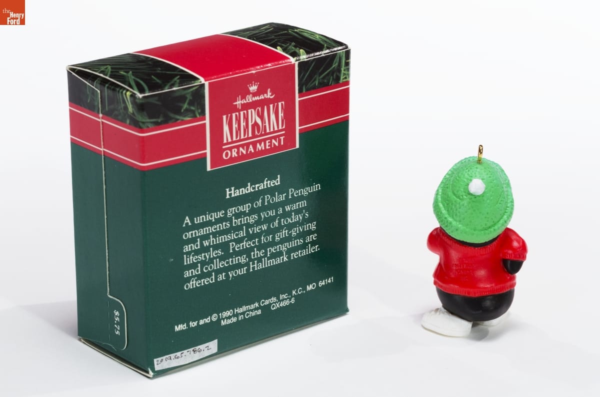Hallmark / KEEPSAKE / ORNAMENT / Handcrafted / A unique group of Polar Penguin / ornaments brings you a warm / and whimsical view of today's / lifestyles. Perfect for gift-giving / and collecting, the penguins are / offered at your Hallmark retailer. / Mfd. for and (C) 1990 Hallmark Cards, Inc., K.C., MO 64141 / Made in China QX466-6