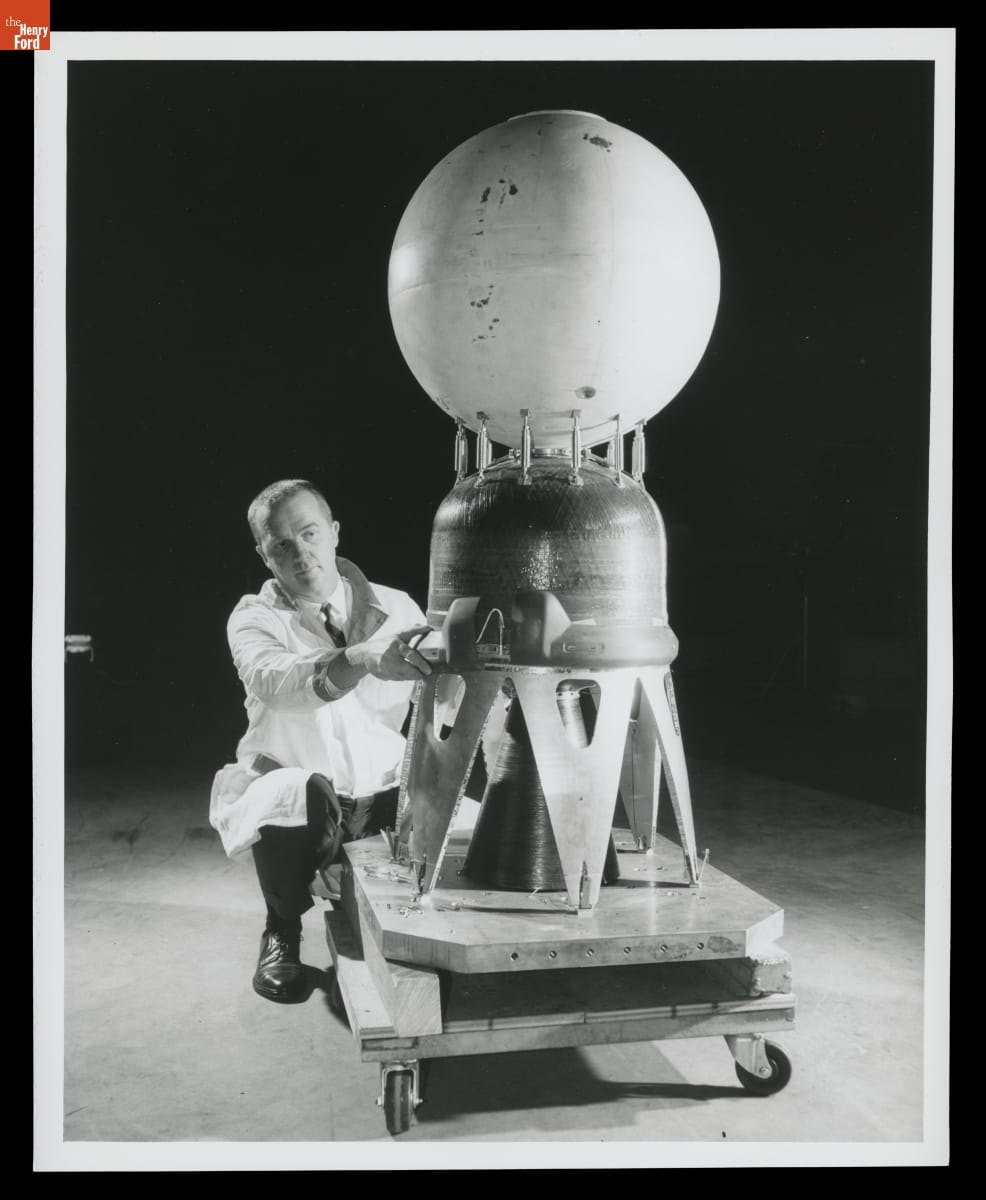 Engineer with Model of Spacecraft to Carry a Lunar Capsule, Ford Motor Company Aeronutronic Division, 1960