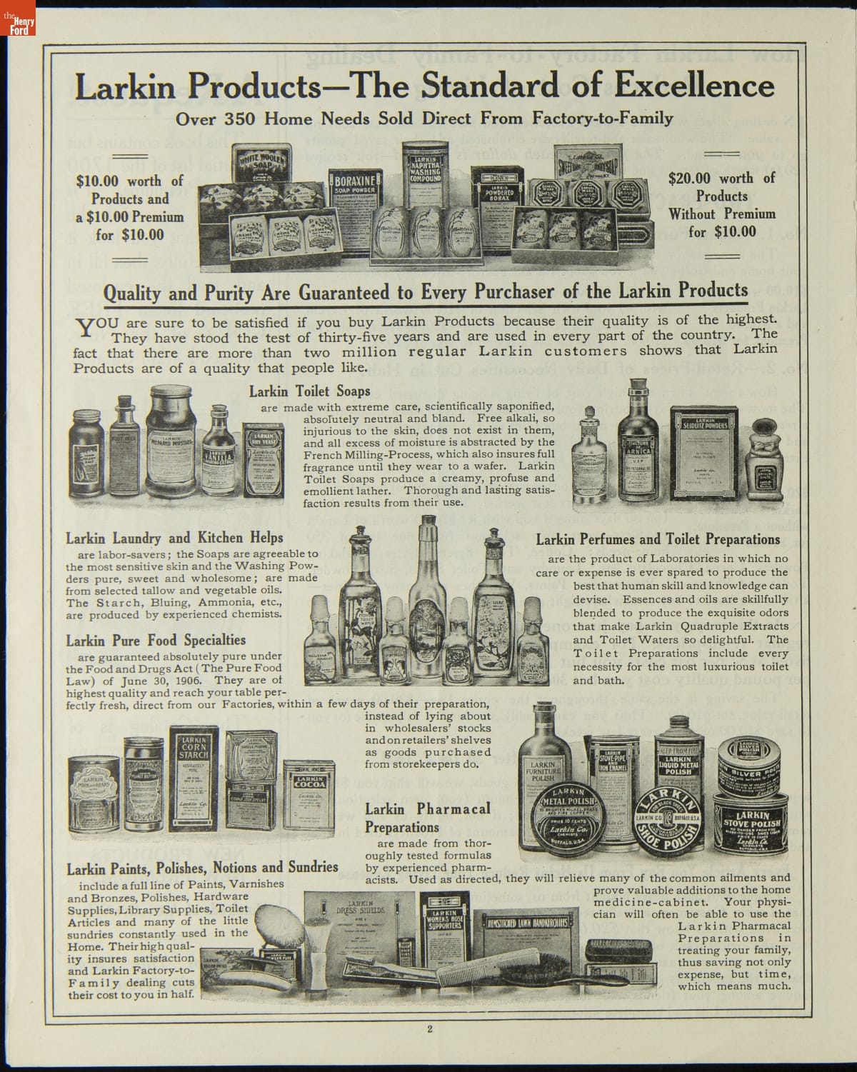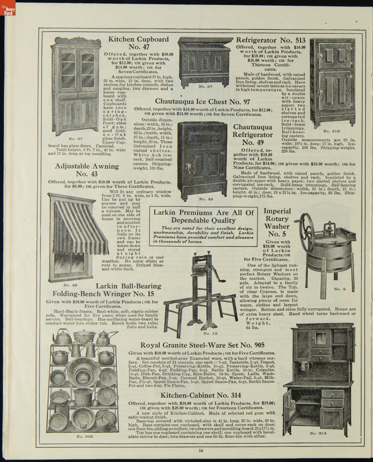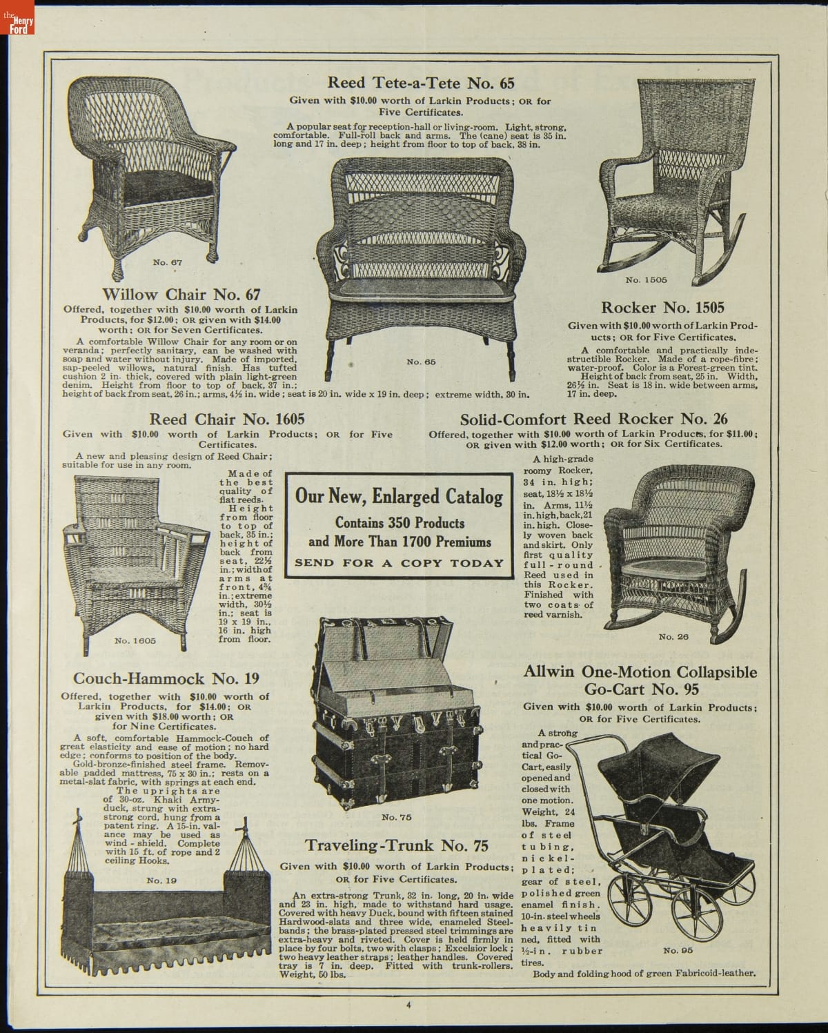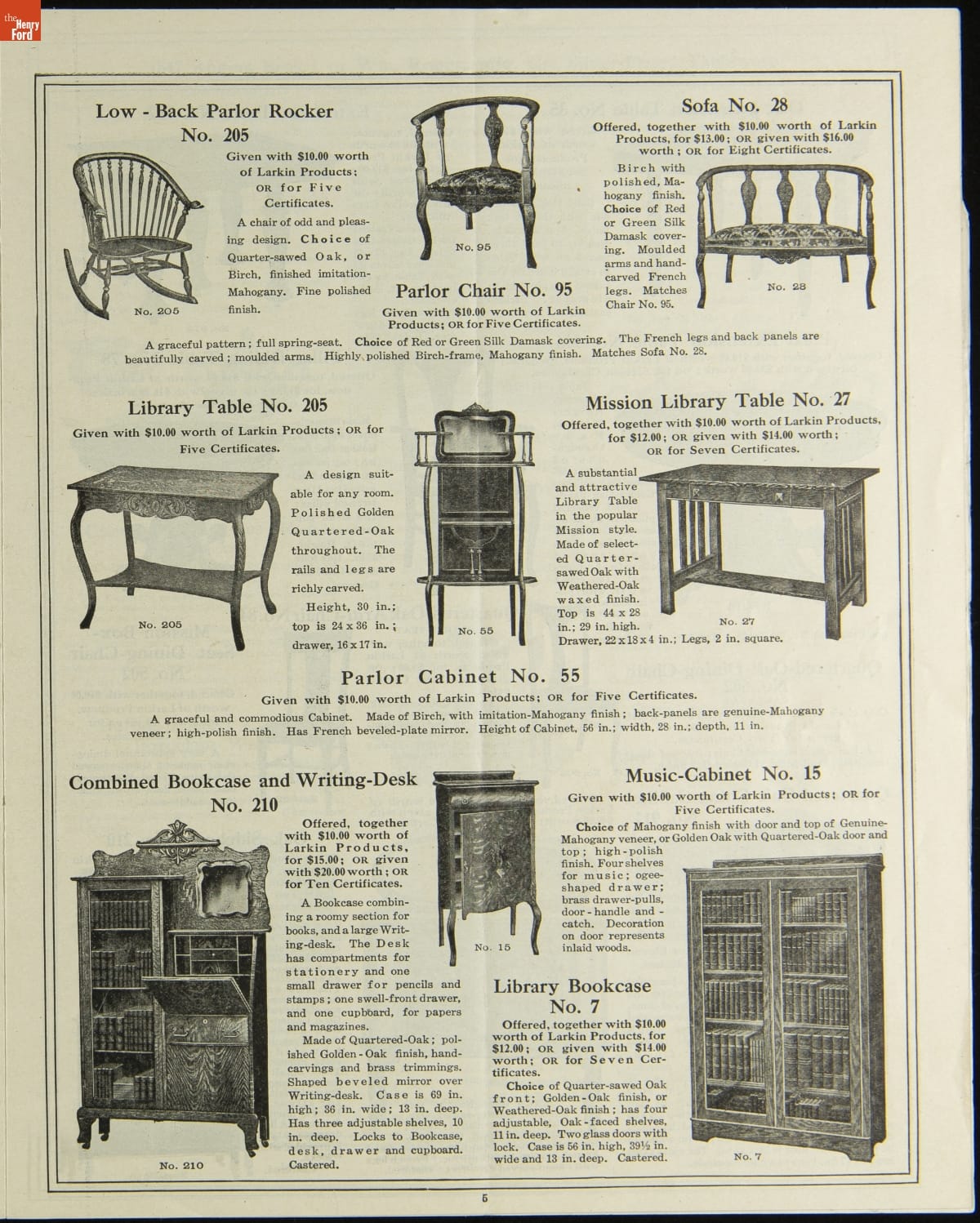 John D. Larkin established a soap manufacturing company in 1875. He hired his brother-in-law, Elbert Hubbard, as a salesman. Hubbard developed "The Larkin Idea," a plan that sold goods directly to consumers through mail-order catalogs and offered incentivizing giveaways. It was a success. By the early 1900s, Larkin's catalogs contained pages of products and even more pages of premiums from which customers could choose.
